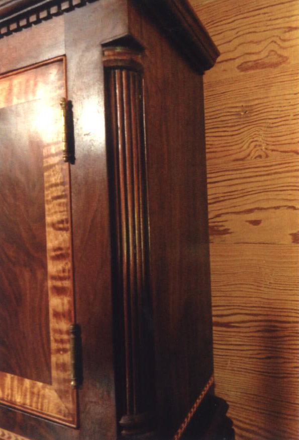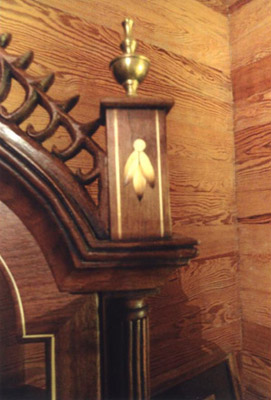 I found that the fluted columns and quarter columns were rather interesting to do. Once the wood had been turned on the lathe to the proper diameter I took a straight-edged metal ruler and scored a line the full length of the column. I then used a Stanley beading tool and carefully followed the groove of the score line. Once the first bead or flute had been established, then successive flutes were easy to create. For the quarter columns, four pieces of wood were glued up with a layer of brown paper between each piece. Once the wood had been turned to the proper diameter, I used a chisel to separate the wood at the glue joints, giving me four quarter columns. Again a line was scored and the hand beading tool was used to create the flutes.