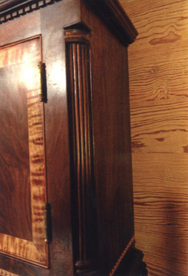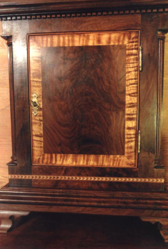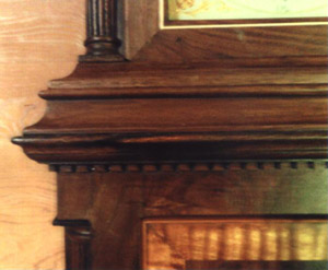The fretwork on top of the clock was first cut out with a coping saw and then all carved by hand. The stringing at the base of the clock was also all made by hand using maple and mahogany. I used a herringbone pattern that I felt was appropriate.