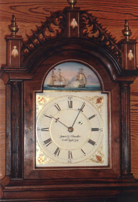 The dial was hand painted by an artist from Georgia who specializes in clock dials. While I am usually not all that struck with naval battle scenes on a clock face, this one seemed exceptional. It depicts the battle between the Hornet and the Penguin. The War of 1812 had come to an end, yet without the modern telecommunication capabilities that we currently have, the ships that were out to sea had no way of knowing. The Hornet and the Penguin happened upon one another several months after the end of the war, but without knowledge of the war's end the two ships engaged in battle. Even though it was outgunned, the USS Hornet was victorious over the Penguin.