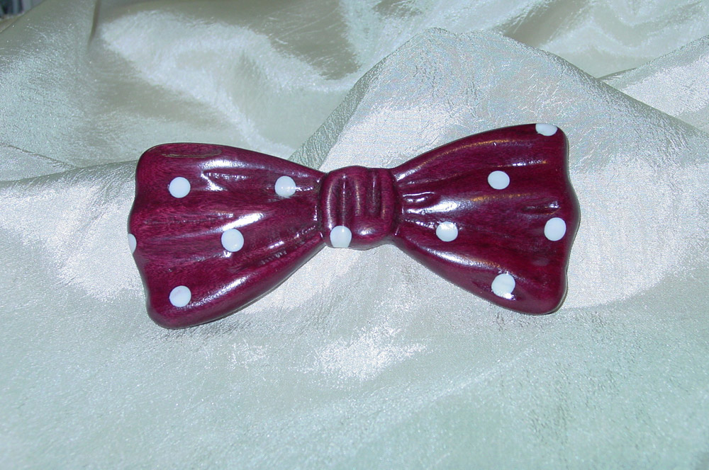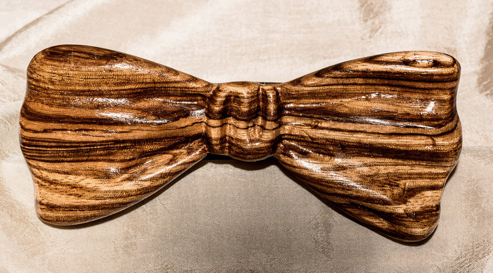 My favorite things to make are wooden bow ties, which I create in a small batch process. I glue up a panel large enough to make eight ties with the desired design – plain grain, bias stripes, laminates, or polka dots – all out of solid wood except for the dots, which are acrylic. The ties are roughed out on a CNC router. I then refine and smooth the surfaces, add finish, and attach the Velcro neck band. New designs and combinations are always popping into my mind, which is the most fun part of the process.