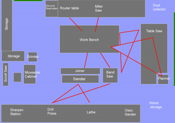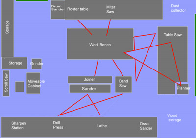 In many of the workshops that I have seen, the woodworker has created work zones. For example there is an area for the drill press, another for the lathe, one for the table saw, planner, joiner, etc. The problem is that these work zones often do not relate to the work flow that takes place in the shop. Once you have decided on a particular