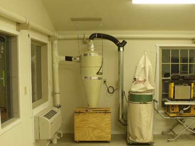 You may remember that I put a four inch PVC pipe in the concrete slab from the wall to the center of the first bay. This is for the sawdust removal at the table saw. I found a used 2 HP Grizzly dust collector with a homemade cyclone and set that up with 4 inch PVC piping around the shop. Sawdust collection and control is something that you need to do your own research on. There really is much to learn and depending on your own situation, you could put a lot of effort into this. Me? I've been breathing sawdust all my life and I'm thinking anything to minimize at this point will be for the better.