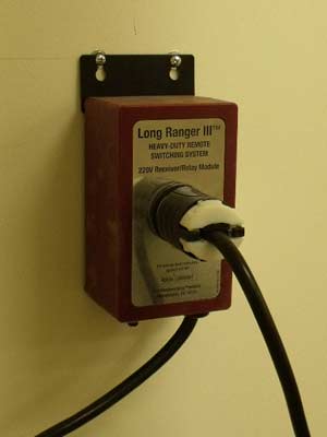 from Highland Woodworking. There are several models of this device including a blast gate setup. It plugs into your electrical outlet in front of your machine and with a remote keypad you can turn it on or off. The keypad can clip on to your belt, apron, or fit in your shirt pocket. So far, in practice I leave it on the fence of my tablesaw.