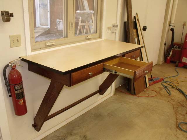 Finally, to draw this to a close, I needed to make an administrative area. A place where I could conduct some business, keep the shop radio, and store some things. So I made up this desk with some of the scrap materials that I had. It's all attached to the wall so I could sweep the floor underneath. Three full extension drawers and a solid desk top. You should also notice in the picture that I have installed a class A-B-C fire extinguisher beside the desk and next to the door. I also installed the old pencil sharpener that was in my classroom when I taught woodshop. I figured they had plenty more spare sharpeners in storage and I took it with me when I retired.
