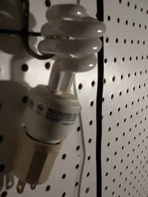 By now, regular readers have figured out that I'm such a tightwad that I squeak when I walk. When I need a quick something from the shop, like a screwdriver, I don't want to turn on an entire bank of lights. Instead, I have strategically located 10-watt CFLs around the shop to give enough light to navigate.