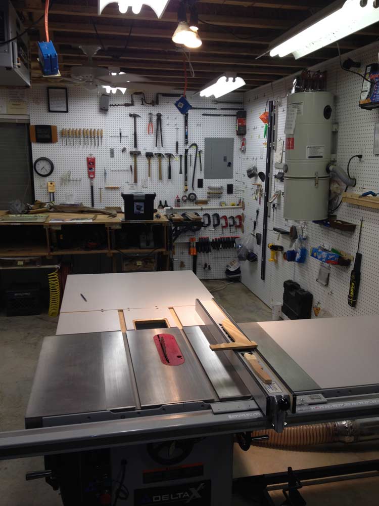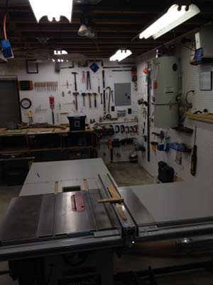 These two floodlamps illuminate the entire table saw area, so no matter what part of the tool I'm looking at, I will be notified that someone is coming.