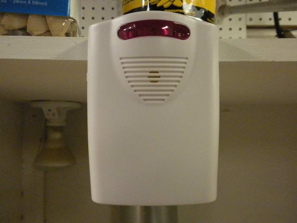 This is the sending unit/motion detector on the stairs leading to the shop. It is so sensitive that our cat can set if off if we forget and leave the door to the stairs open.