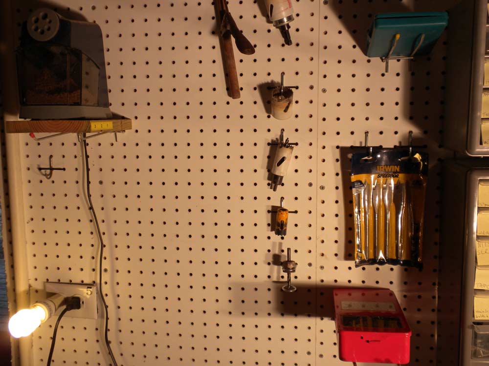 When pegboard is already near where the bulb is used, a simple U-shaped hook holds the bulb until it's time to plug it back in.