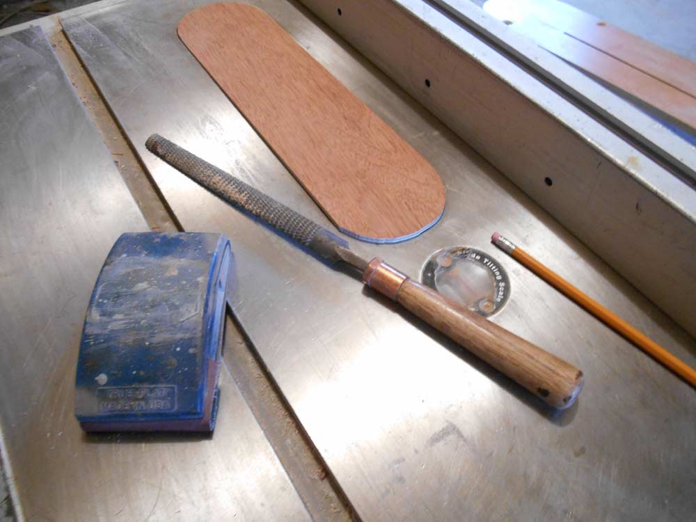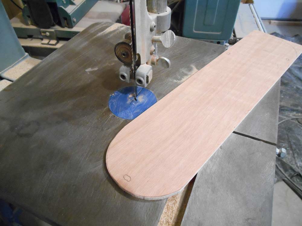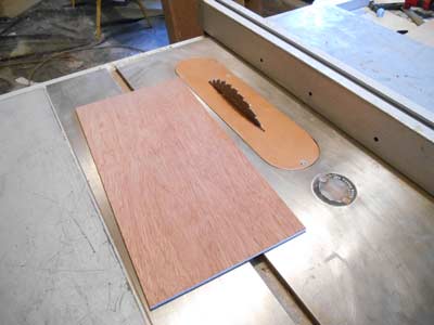 Mark the ends of the top piece to the rounded shape of the slot and cut both ends on a band saw or use a jigsaw. The piece can be marked from the insert provided by the manufacturer. Leave the mark lines when cutting and refine the shape until the piece fits into the slot. Make sure the leveling screws under the insert are completely hidden before further fitting. If the insert sits below the table top raise the leveling screws to flush the insert. I find that ¼ inch plywood is usually slightly thicker than the slot so I thickness sand it until is sits flush. I have a wide belt sander that works great for this job but careful planning or sanding will do the job. One of my lugs is slightly higher than the other two so some special fitting is required there. Finally, smooth the curved ends and ease all the edges with sandpaper.