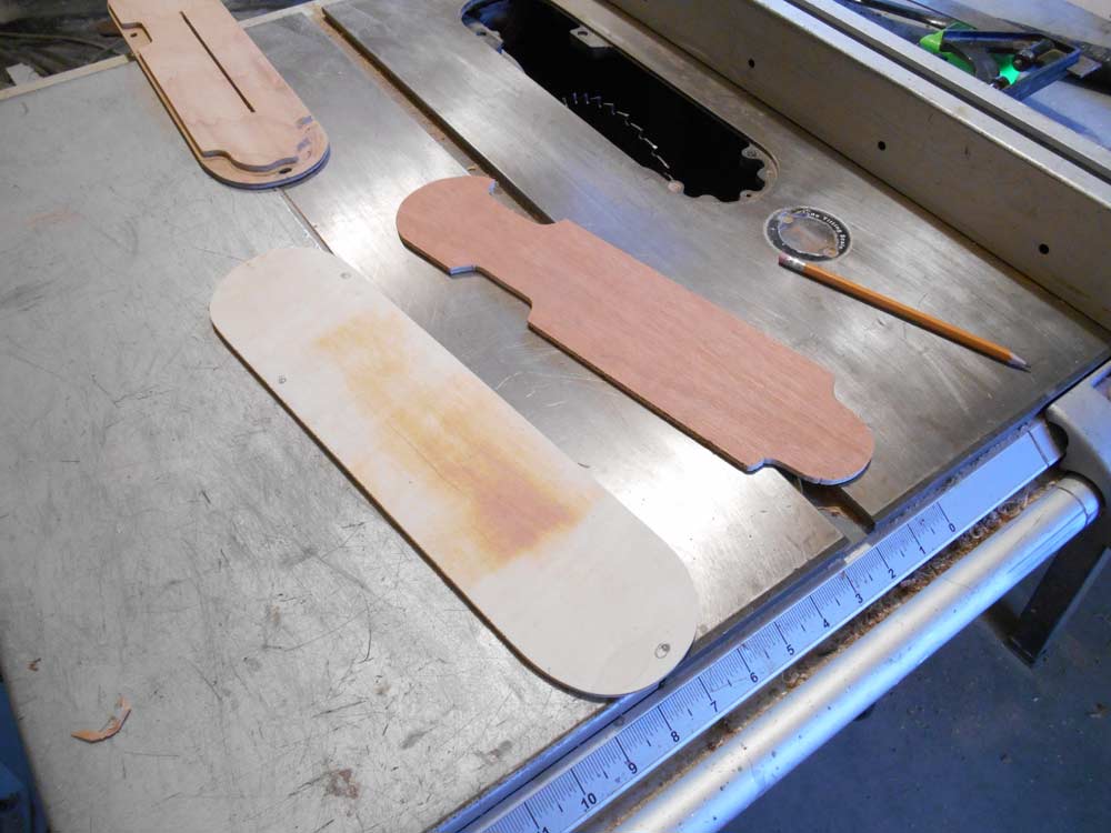The bottom piece is milled until it will pass completely through the slot. I find that if I raise the saw blade high enough to support the piece during this process it helps keep the piece from falling completely through. This piece is used only to support and stabilize the top so the exact shape is relatively unimportant. I try to make this piece cover as much area as possible without interference. This keeps the top from deflecting or vibrating excessively. When the shape is established, smooth the bottom piece and break all edges. Finishing the bottom piece is not necessary as it will never show but I like to make it as neat as the top. Even if no one else knows it is not completely finished, I will.