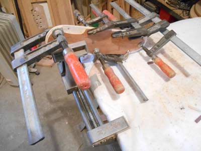 Mark the underside of the top piece at the positions of the mounting screw holes and approximate position of the bottom piece. Glue the two pieces together and clamp near the edges. Make sure the bottom piece is properly positioned as you are looking at the insert from the underside. As the bottom piece is not symmetrical, it can be embarrassing to find out the insert is up-side-down after gluing.