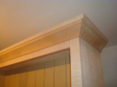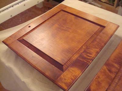 The correct finish and color on a period-style piece built with tiger maple, is without question, the determining factor that will make or break the piece. After doing a great deal of research I decided to use Glen Huey's method for finishing tiger maple. Glen's Illustrated Guide to Building Period Furniture comes with a DVD that includes instructions on tiger maple finishing, along with other great tips. I applied golden amber maple aniline dye to get the amber color. Then I started applying Highland Hardware's water base Ceramithane Matte Finish; after three coats of this finish I had achieved the antique look I wanted for the cupboard.
