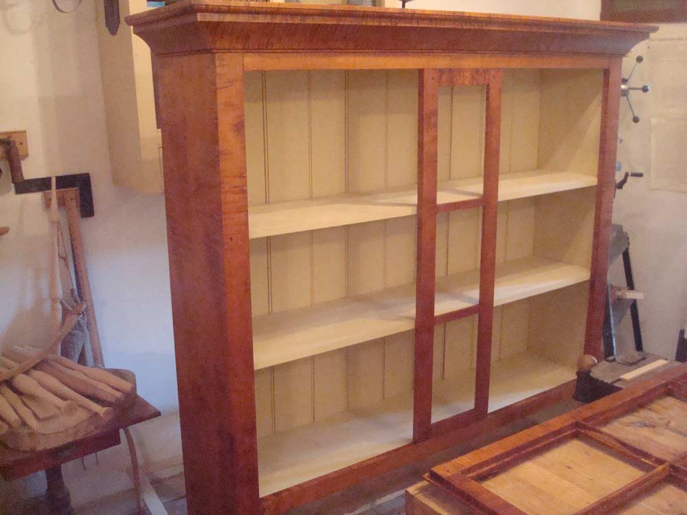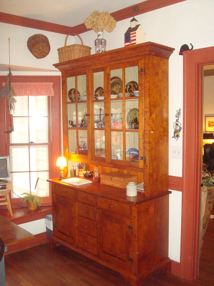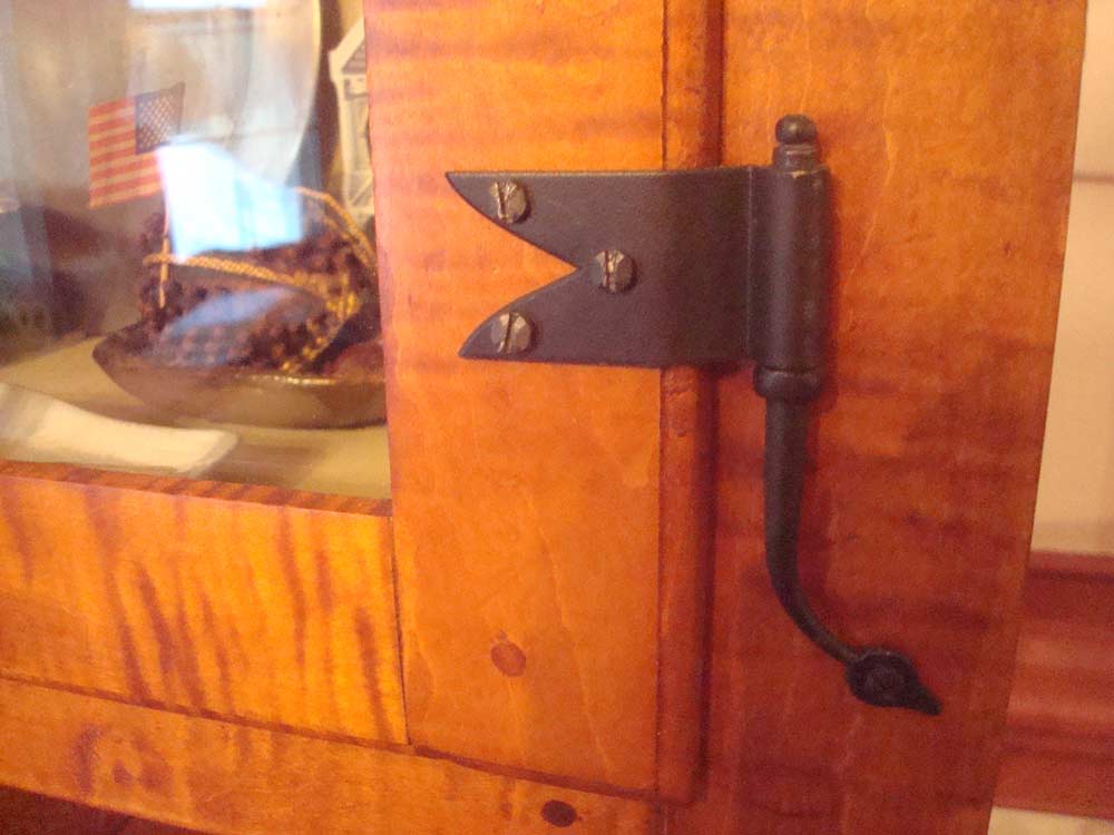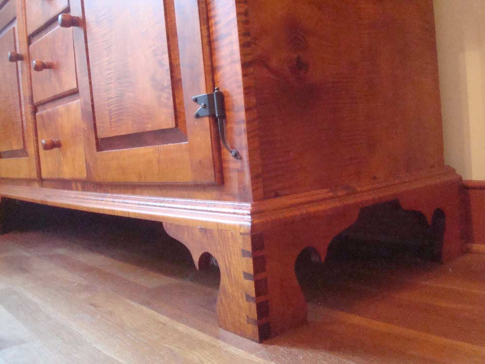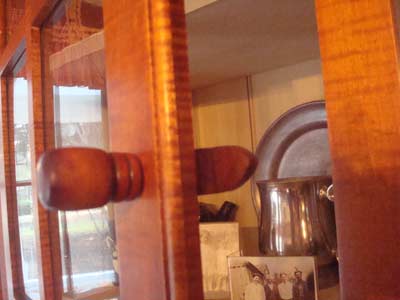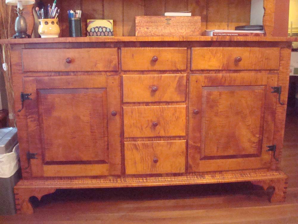 I used tiger maple as the primary wood and poplar for the secondary wood. I used all joinery and pegs with glue to reinforce the joints and there are no nails in the piece. All the pull knobs are hand-turned from tiger maple. The glass in the upper doors is antique from an old Atlanta house c. 1870 - 1910. The hinges are called rat tails, and are hand forged from Ball and Ball.
