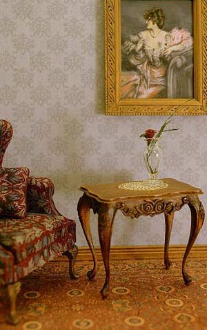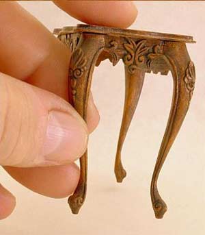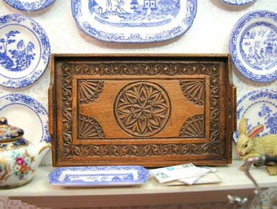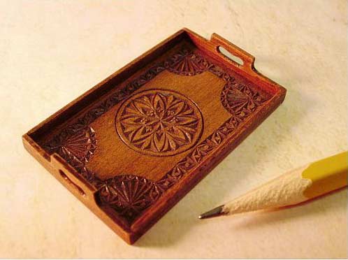 Below are some pictures showing the miniatures I make and why these home made tools are so necessary to me. These items are 1:12 scale dollhouse miniatures. The first 2 pictures are of a miniature, chip-carved, hand-made antique tray made from Pear. This is a piece made from wood thicknessed with my homemade sander:
