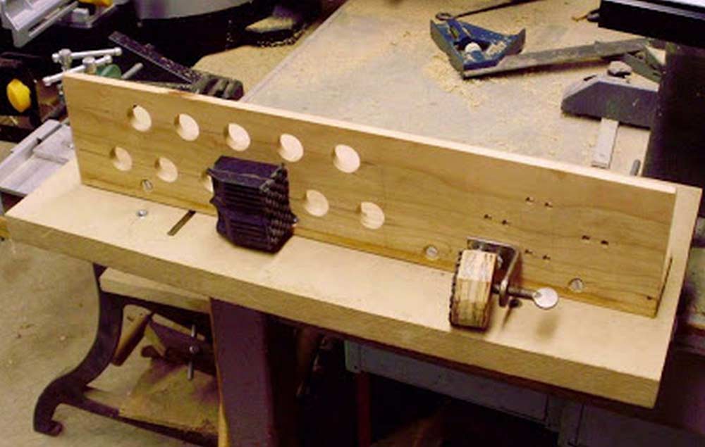 Above is the front of the jig. I "borrowed" a plastic bench dog from a cheap little work table, the kind that opens up and closes flat, to use for the back clamp. I drilled a series of holes to accept the clamp and I added some of that non-slip stuff to it's face. For the locking clamp, I found the perfect thing in the "box of cool junk". As I've said before, junk is your friend! I had to cut off one side and make the plywood clamping surface, again with that non-slip stuff. I drilled two holes in it for the knobs and another series of holes in the fence.