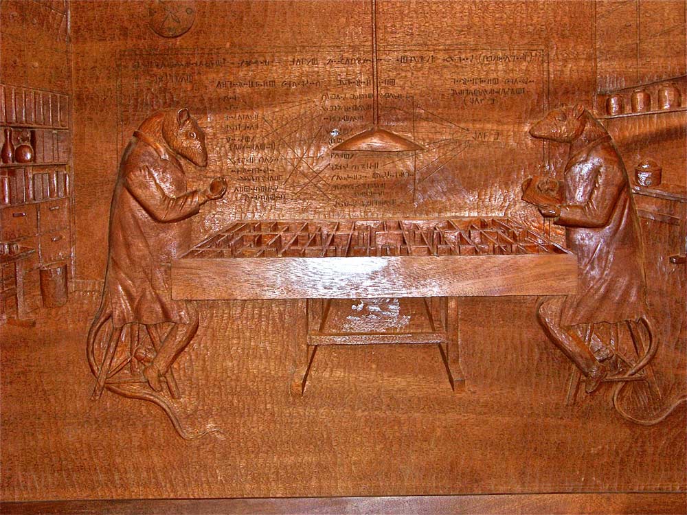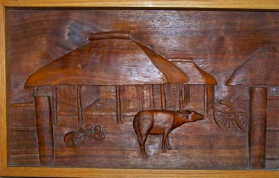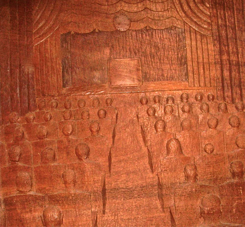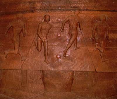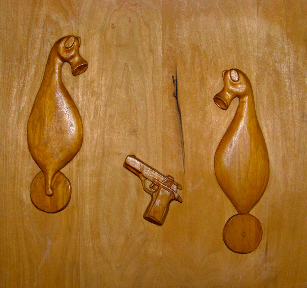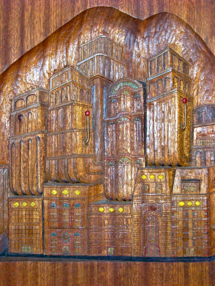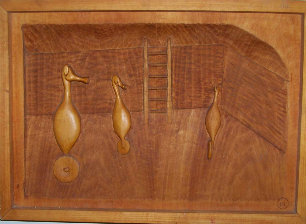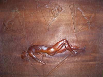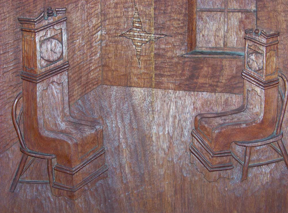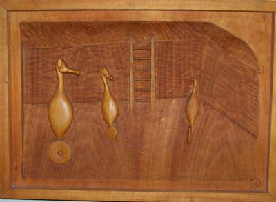 Pictured below and at the beginning of this article are a few Bas relief works done mostly in H. Mahogany. My work has been influenced by the Surrealists. Works here range in size from 20" x 20" for Grandmother and Grandfather clocks, to 28' x 42" x 2" for "social science research."