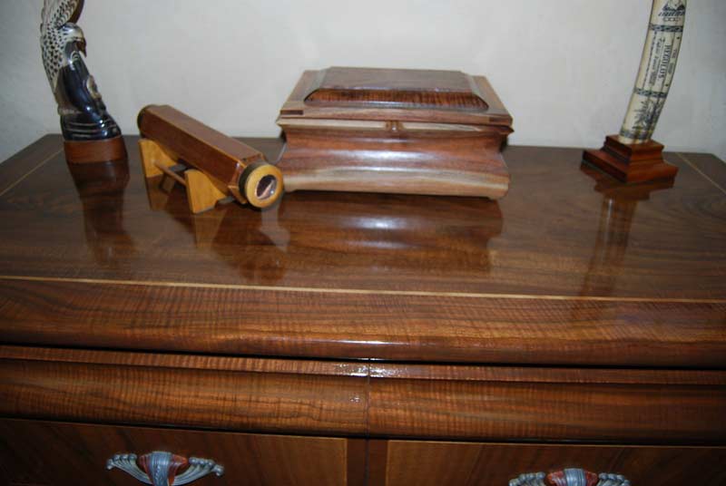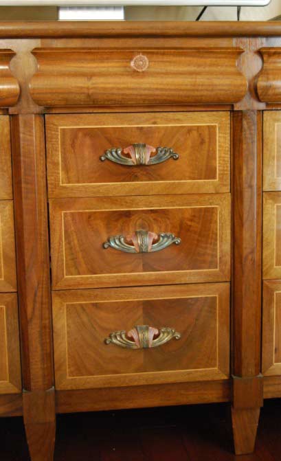 The hardware on the flat drawers is original 1930's Art Deco Bakelite with bronze metal. The serpentine drawers have glass pulls. We think the hardware sets off the drawers perfectly and feel very lucky to have found enough of them online to complete the set. The drawer sides and backs are made from red oak. The drawer slides are maple. The finish is General Brand Arm-R-Seal wipe on gloss. It is very easy to use and gives a beautiful durable finish.