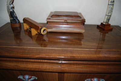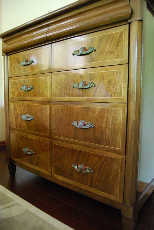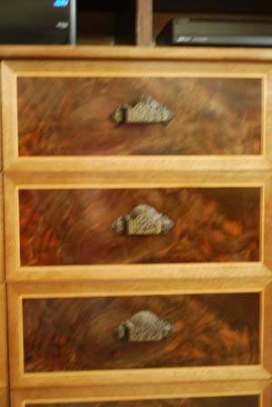 Next are the dressers. She varied the design a little bit on each one to add some variety to the set. As with the nightstands, the dresser drawers are all book matched crotch wood. The drawer details in the night stand drawer fronts are the same in the dressers as in the nightstands. She decided to make the hexagonal columns a little larger in the dressers to avoid a 'spindly' look. There are columns between the banks of drawers in her dresser, but not in mine. My dresser features two serpentine drawers that join one another so it appears to be only one drawer. We decided not to put hardware on these drawers because we didn't want to interfere with the smoothness of the look. Instead I carved a little notch into the bottom of each drawer underneath so that they could be easily opened.
