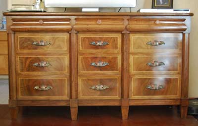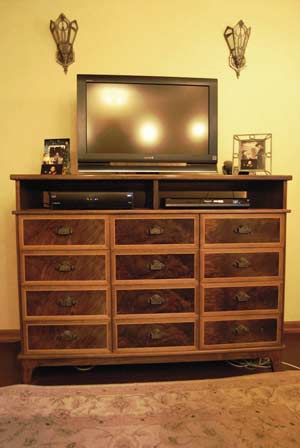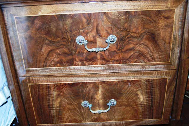 To get a wide selection of boards, we purchased a couple of milled walnut trees. The walnut in all the bedroom pieces came from the same tree. I am always amazed at the variety of color, texture and illusions that nature provides in a single piece of wood; just one of the many wonderments of nature. Once the nightstands were completed, we had a good idea of how to develop the two dressers. Again, we were using Kathie's design and my woodworking.