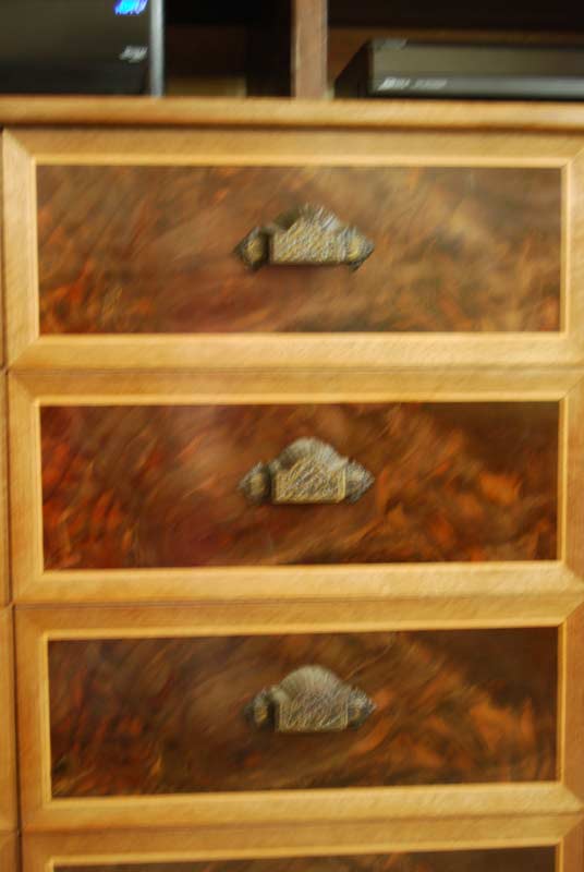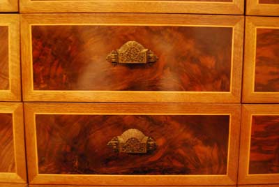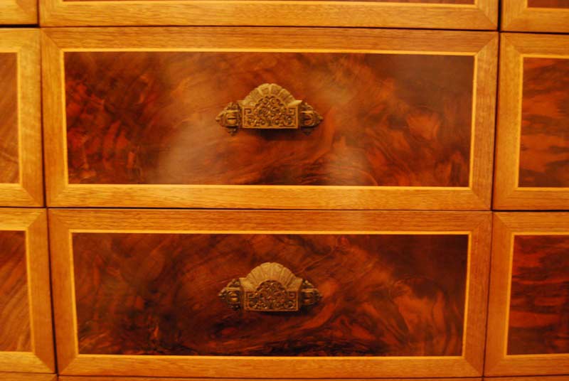 Each bank of drawers is book matched and the faces have incredible depth. We spent a lot of time selecting the wood for the drawer fronts so that we could get something very special. We chose them for their color and intricate figuring. The drawers are almost iridescent.