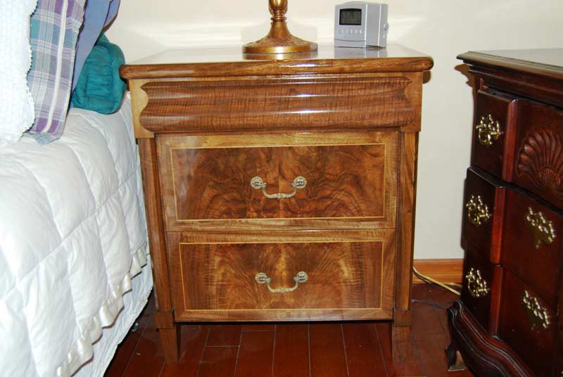 The drawers are the focal point of the night stands. The top drawer is straight grained walnut cut in a serpentine pattern which shows off the vertical lines in the wood. The lower two drawers have an outside 'frame' in very uniform grained walnut sapwood. A maple inlay sets off the book matched walnut crotch wood as the inside face of the drawer frame. They were all re-sawn with a Highland Legendary Re-sawing blade. There is a hexagonal column on each side of the inset drawers.