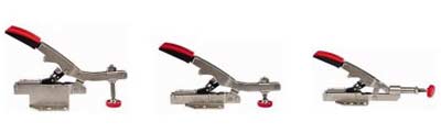 The unique feature of these new clamps is the automatic locking adjustment mechanism. The toggle clamps automatically adjust to different workpiece thicknesses while maintaining constant clamp pressure. An adjustment screw sets the clamping force anywhere from 25 to 550 lbs, depending on the amount of pressure needed to hold your work solidly.