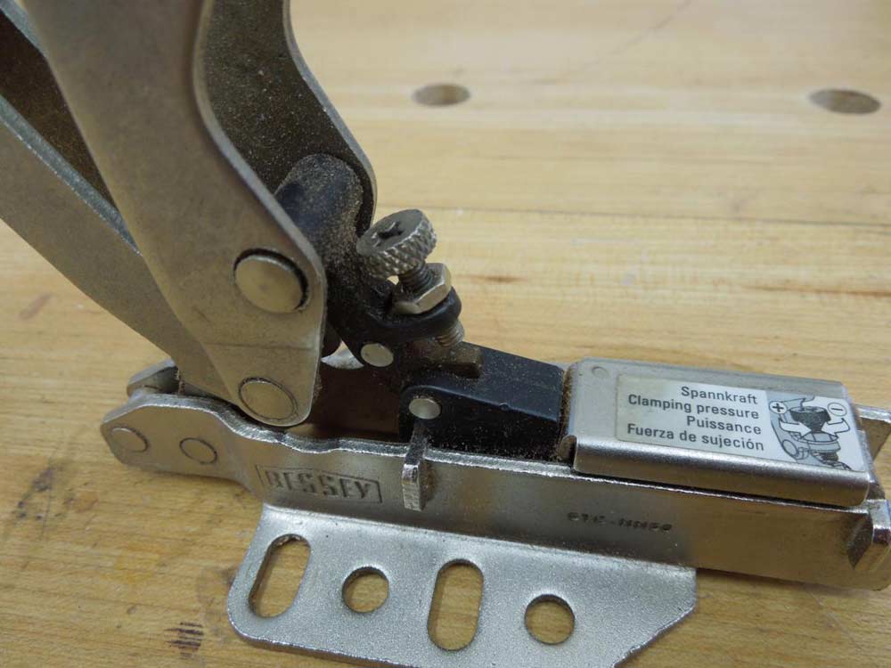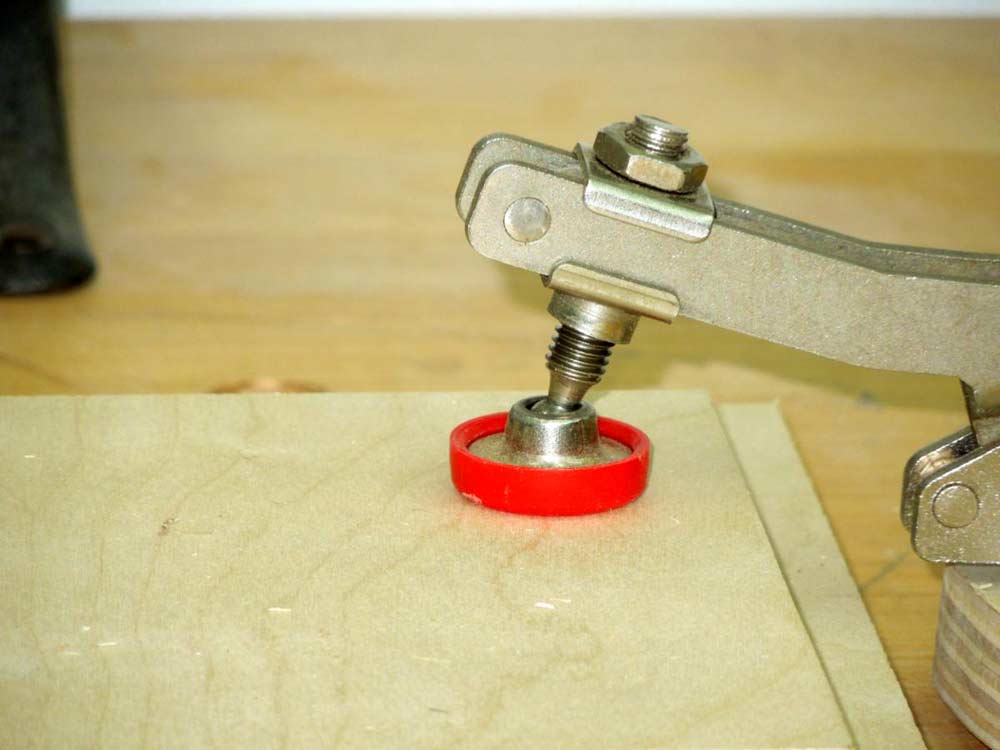 One of the unique features of the toggle clamp is the swivel head. In this close-up photo you can see how the clamp pad stays flat and parallel on the board even as it changes thicknesses. This is important to maintain uniform clamping pressure.