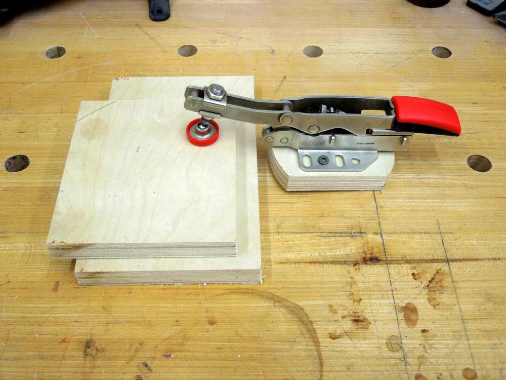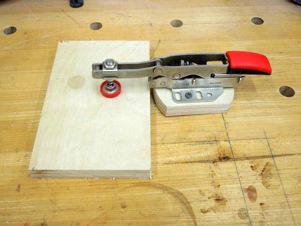 One of the nice things about toggle clamps is their versatility. I can use them on jigs and fixtures like I've shown here and also use them as a hold-down on my work bench. By making a small platform for the clamp, I can move them among my workbench dog holes. In this case, I mounted a 3/4" dowel in a small piece of plywood and then screwed the toggle clamp onto the plywood platform. Using the clamp like this I can position it anywhere I need to on my bench.