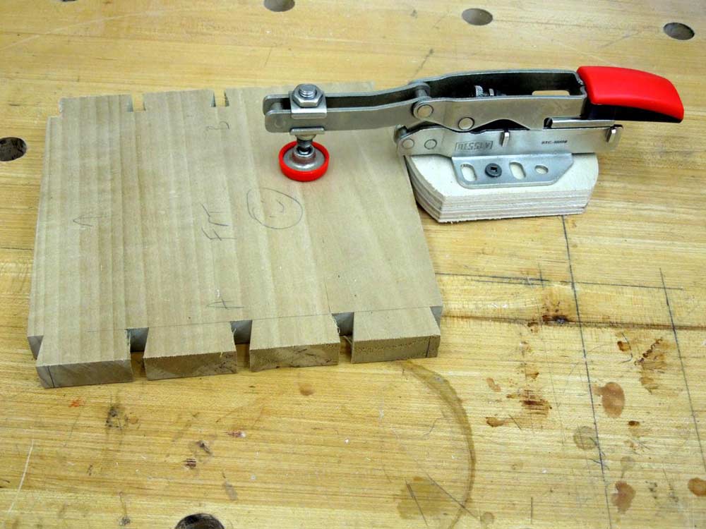 This arrangement makes if very convenient, for example, when working on dovetail boards. You can easily clamp the board to the workbench while using a chisel and mallet to form the dovetails. If you like to stack multiple boards so that you can work on multiple waste areas with one setup, you can easily do that with this toggle clamp.