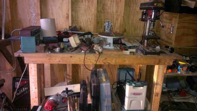 The first pragmatic advice based on hard lessons that I can offer is the first step to serious woodworking is work holding. Typically work holding refers to a monster bench with vises of adamantine power that costs thousands of dollars retail, but don't fall into this trap too early. The monster bench will be in your future if you take up woodworking seriously. The work surface you get now should be procured within means and built by you, but this should be your first big ticket item. Work sliding all over the place makes learning techniques far more difficult. My first bench was built from the cast offs found in the rubbish pile outside a home under construction. I have long since moved on, but that first bench (in the cluttered picture below) is still in use housing the drill press, jigsaw, metal working vise, and combination disk/belt sander.