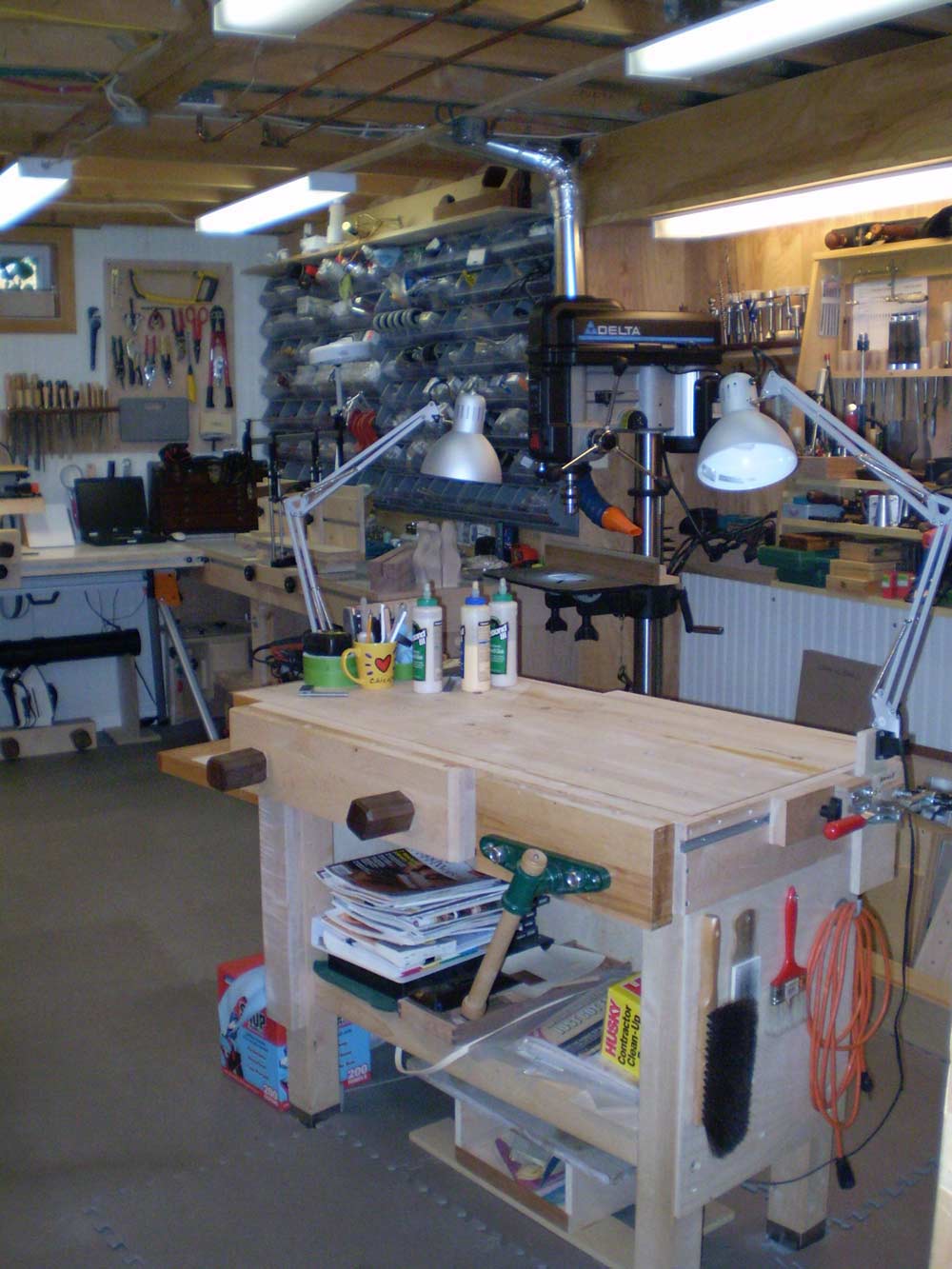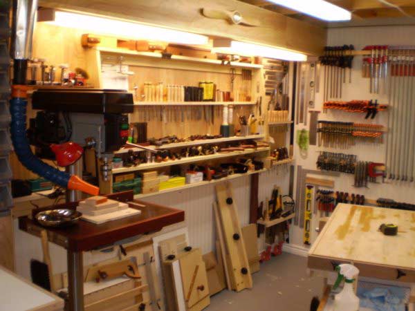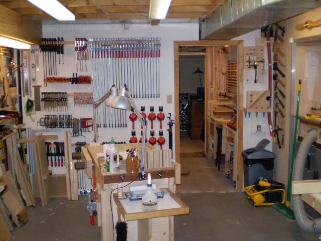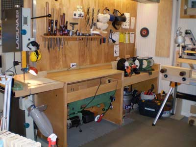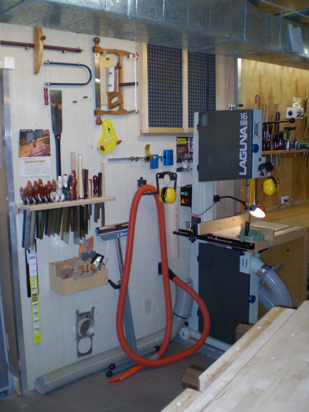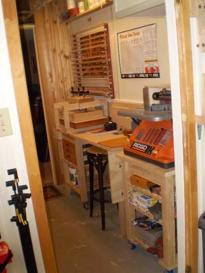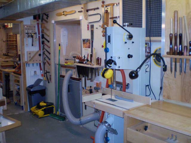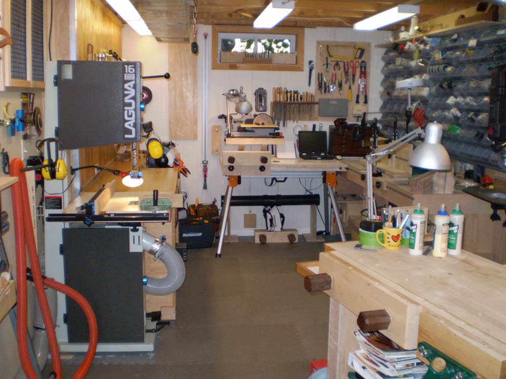 Due to a recent move I had to design and build a new workshop. My shop is located in my basement so there is a strong focus on dust and noise control. The shop is roughly the size of a single car garage with annexes. The entry area leads from the rec room and is a machine storage and veneering/inlay work area. The only permanent fixed machines in the main shop are the 16 inch band saw and the 18 inch drill press. The main shop has an absorbent mat floor and a mix of natural fluorescent area lighting and incandescent task lighting.