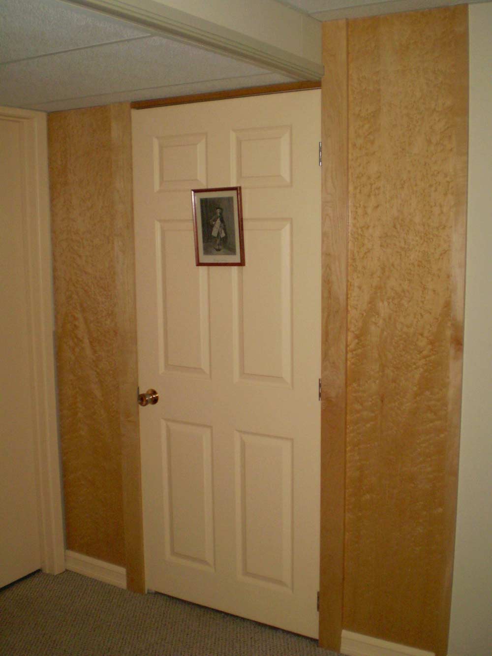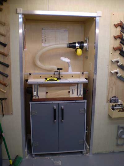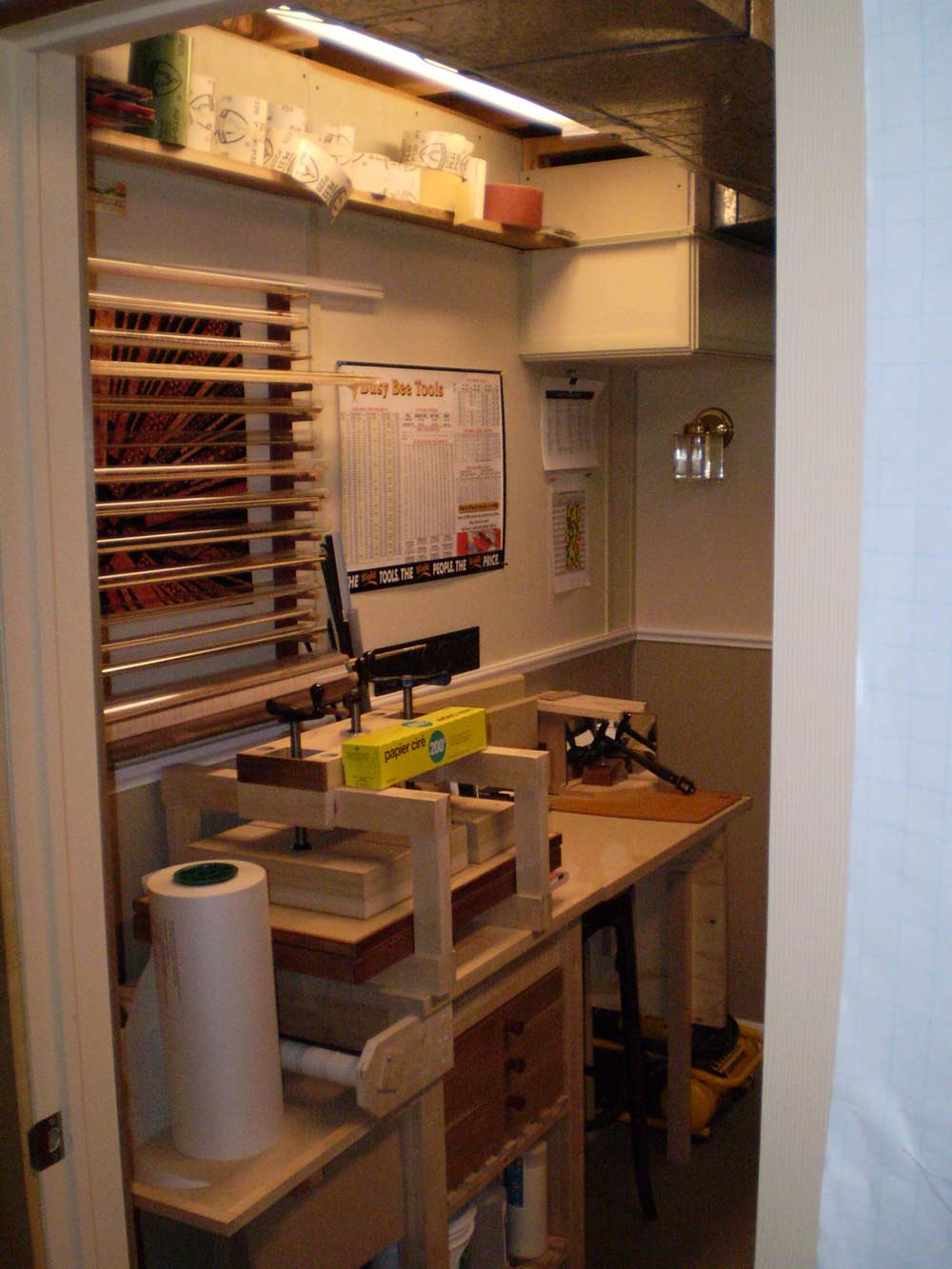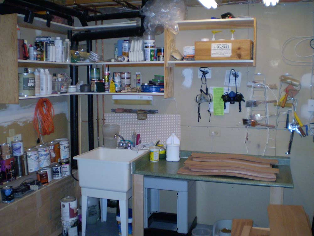 Due to a recent move I had to design and build a new workshop. My shop is located in my basement so there is a strong focus on dust and noise control. The shop is roughly the size of a single car garage with annexes. The entry area leads from the rec room and is a machine storage and veneering/inlay work area. The only permanent fixed machines in the main shop are the 16 inch band saw and the 18 inch drill press. The main shop has an absorbent mat floor and a mix of natural fluorescent area lighting and incandescent task lighting.