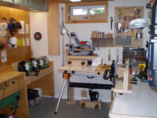 Because of the small size there is a lot of multi-use space. There are two flip over tables, one for a lathe and the other for power sharpening equipment. When flipped over planks are put in place to fill in the outfeed table top. The area also serves as an assembly bench. In the photos below the lathe is "down" while the grinders are "up". This is the most useable configuration for me as the lathe is not used very often while the five feet of out feed area for the band saw meets 95% of my requirements.