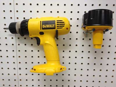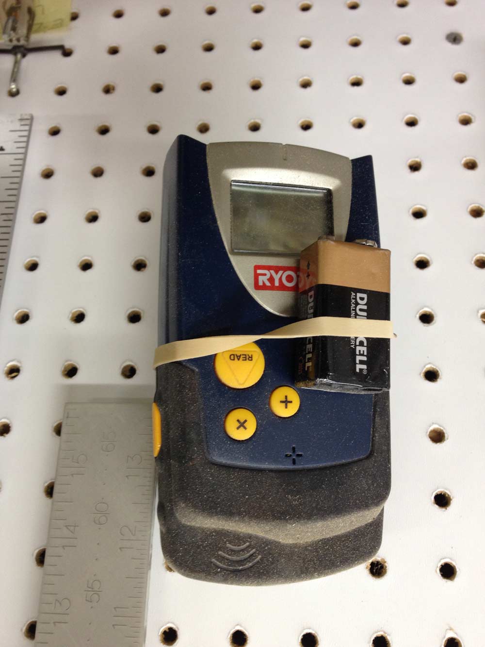 When possible, I rubber-band the battery to the device, so it's completely handy. Some of the tools I use this technique on include: metal detector, which I use mostly when working with "found object" lumber, remote control for the air scrubber,