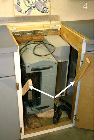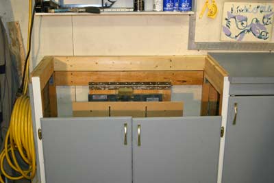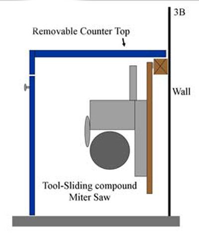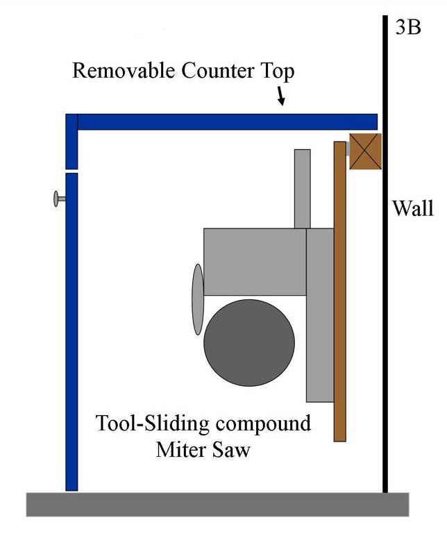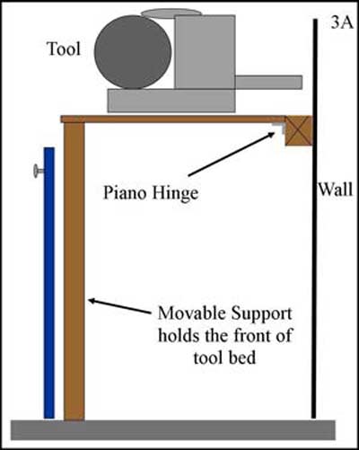 In the diagram 3A below, the top has been set aside and the tool is swung up into working position on its piano hinge attached to a 2x4 ledger fastened to the exterior wall. The front edge of the tool is supported by wooden legs that are attached to the cabinet sides with one screw so they can swing into place when needed, (see picture #4 arrows). In diagram 3B the tool is swung down for storage and the counter top is put back in place forming a work surface when the tool is not required. As I described earlier, there are 3 tools mounted in the same fashion and each can be in place for production or put away as fast as I can swing them up or down.
