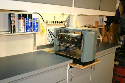 When the planer is in use, you can see that the planer bed is even with the bench work surface making both in and out feed tables.