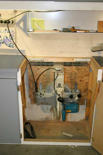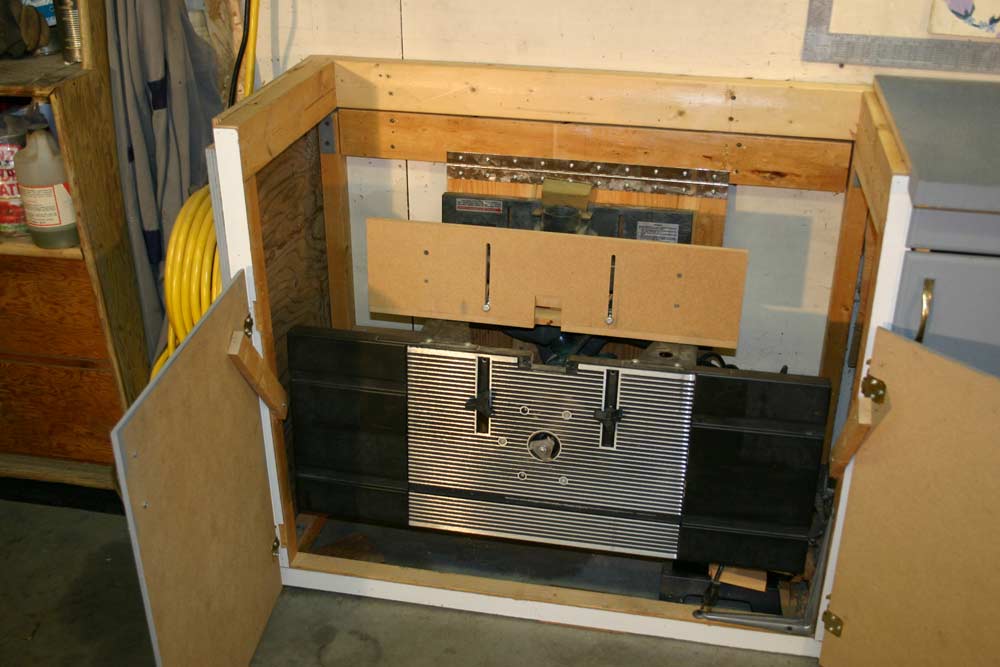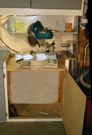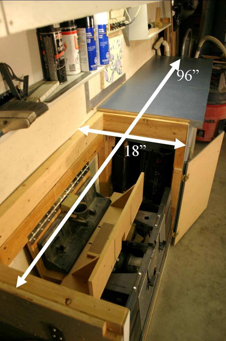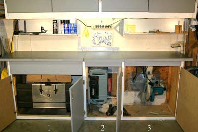The numbers in the pictures and the floor plan represent some of the power tools in their cabinet. #1 a 24 inch long router table, #2 the 12 inch thickness planer, #3 the 10 inch sliding compound miter saw. Each of the tools is mounted to a plywood shelf that is attached to the inside back of the cabinet using a piano hinge. The height of the piano hinge was set so when the thickness planer and the miter saw were swung up into place for use, the bed of each of the tools was even with the top of the cabinet and served as a bench to support the material being cut. Each of the cabinets has a lift off top to allow the tool to be swung up for use. And the cabinet doors are the proper size so that when the tool is up for use the doors will swing shut under the tool to be out of the way.