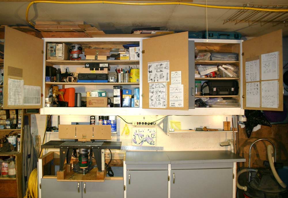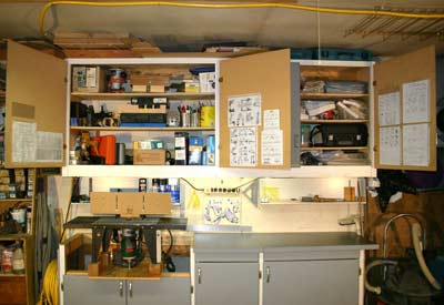 To maximize the space I built a full length overhead cabinet to contain tools and supplies. I installed fluorescent lighting to the underside of the cabinet and a couple of shelves under it for parts and tools. The inside of the doors are a great place to attach all of the shop charts and diagrams in plastic protective sleeves always ready for quick reference. I left the cabinet about 5 inches down from the ceiling, leaving space for another convenient storage shelf.