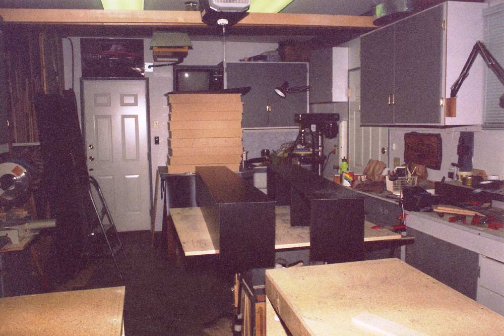 Here is a list of all the tools that had to be ready to go in 15 minutes; 10 inch floor model table saw, 10 inch sliding compound miter saw, 24 inch long router table, 10 inch thickness planer, a floor model drill press and as much work bench space as I can get. If I had each of these tools individually set up on their own work stand on the shop floor it would pretty well eliminate all the floor space makeing production a challenge at best.