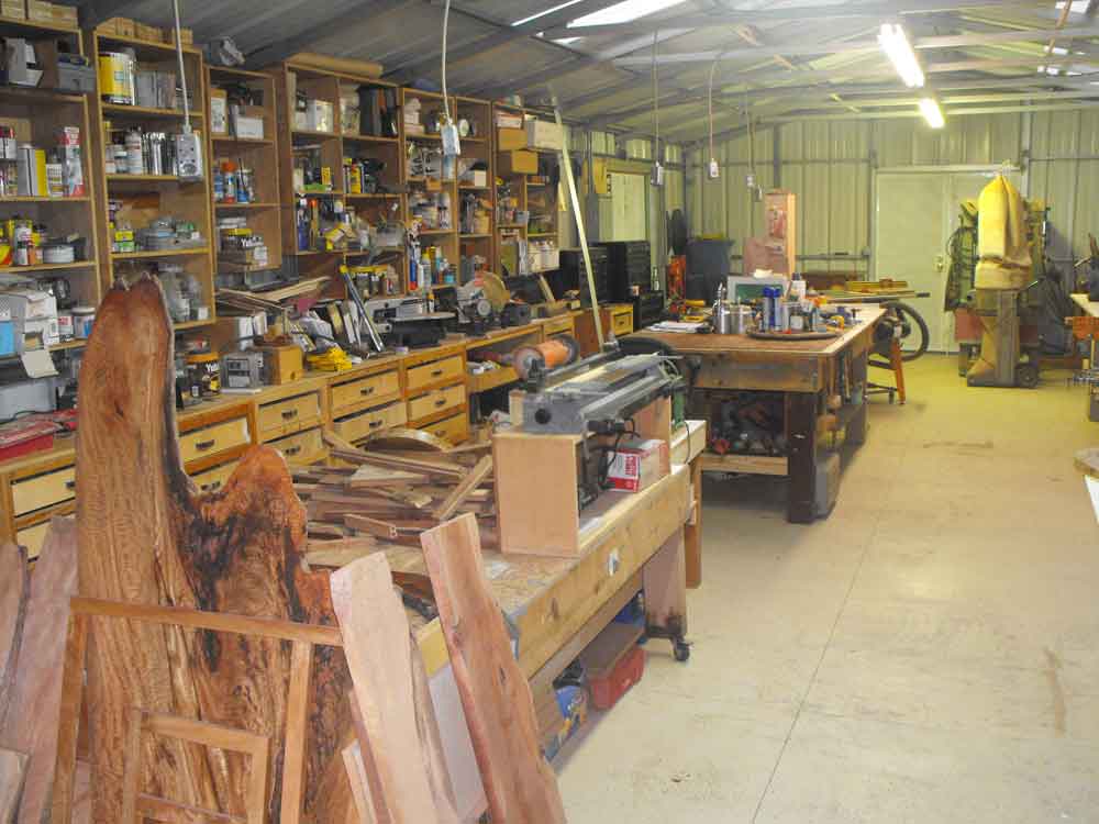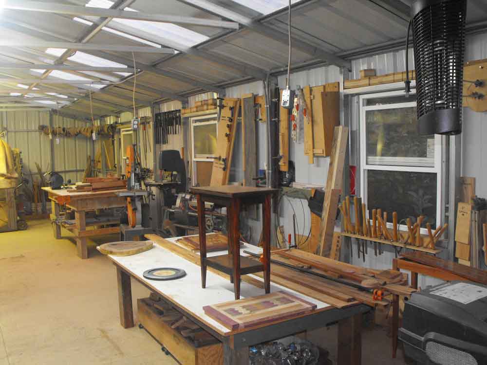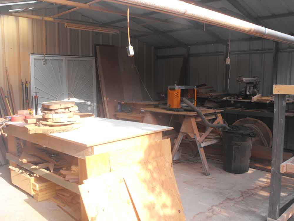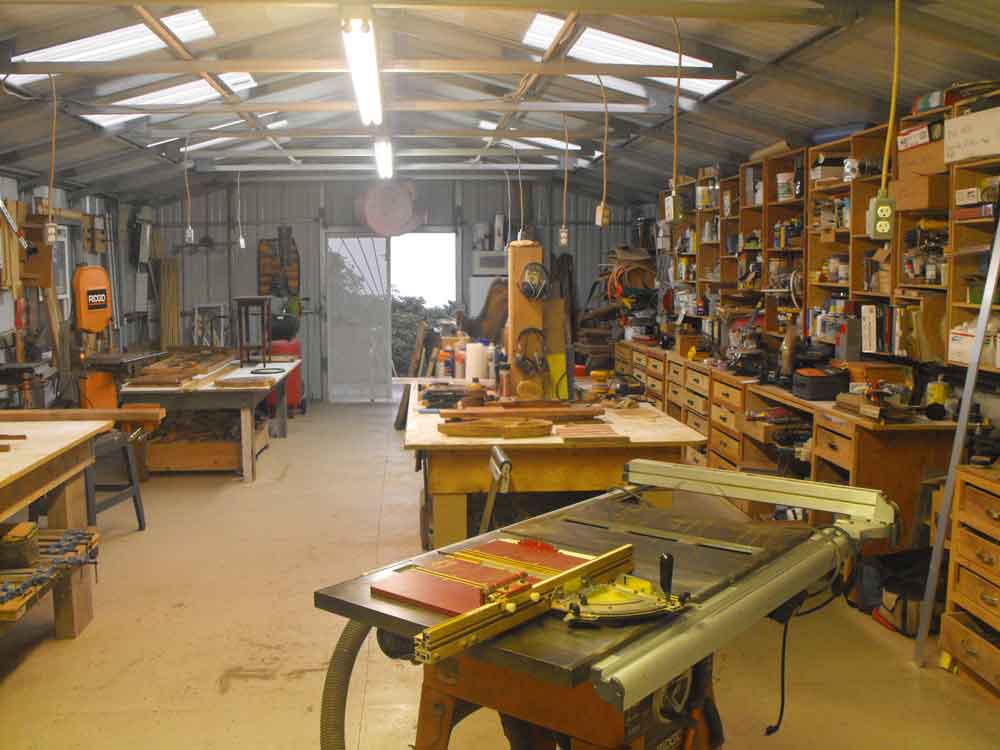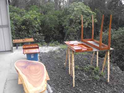 My workshop started in a 20' x 20' room attached to the garage, but my wife decided she needed that for a guest room, so I was forced to build a 64' x 24' steel building for my workshop. Oh woe is me! Since we have a prevailing ocean breeze, I located the new shop which two helpers and I built at the back of our farm with the paint "booth" outside next to the Avocado trees in front of my shop. All the dust blows away from painted work. The back of my shop is open on two sides and is where we do all of our sanding and planing. Thus the majority of dust blows to the back of our property away from our home. We have 100 avocado trees and I manage my neighbor's 1000+ avocado trees with a work crew daily. Our fruit is sold throughout Hawaii to groceries.