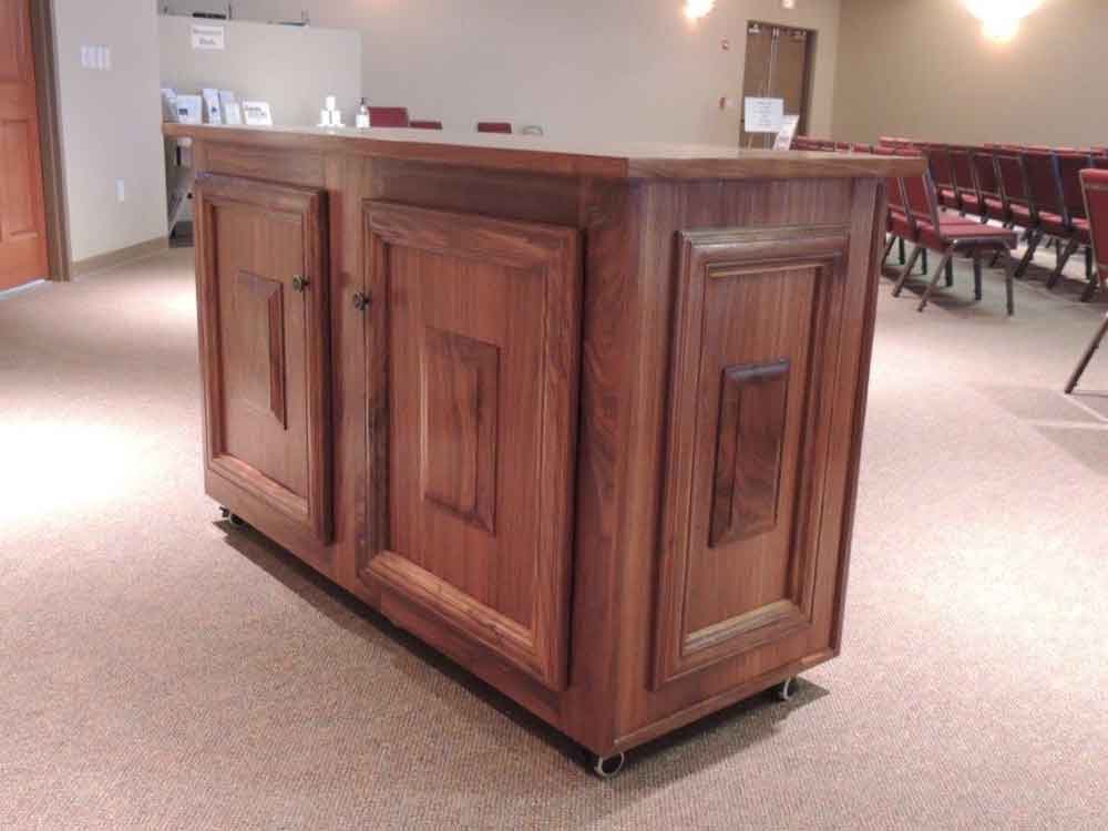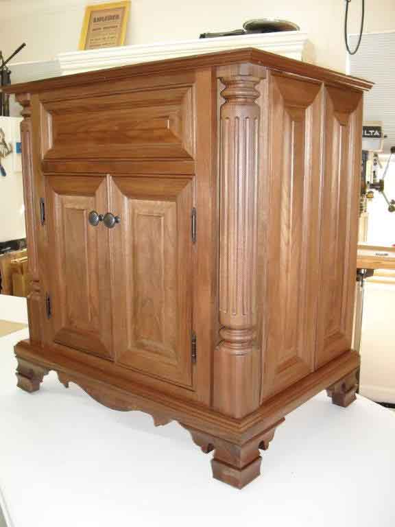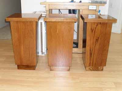 I am a woodworking amateur but have been at it for more than 25 years. I like to design and build furniture as evidenced by the pictures of a serving cart, the bathroom vanity and the round lamp table. I have also created numerous small items including jewelry boxes and cremation urns. A lot of my work is for my church on a purely voluntary and gratuitous basis. Included in this category is the serving cart, the step stools (for little ones to reach the clean-up sinks), the flower stands and the oak table to hold Bibles and bulletins.