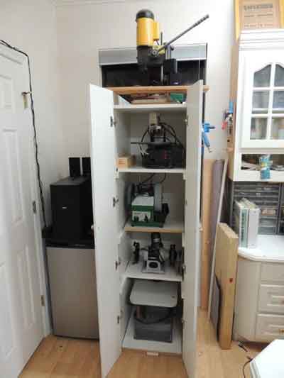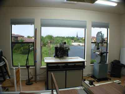 There is a very picturesque view of the pool and pond behind the house but, as one can see, there is one big drawback in that the shop is located on the second floor of our home. Bringing lumber up and returning some of the larger projects to ground level can be quite a job, but the exercise is beneficial. The recent addition of a homemade spray booth which vents outside was all that I needed to complete this fully functional "Retirement Shop."