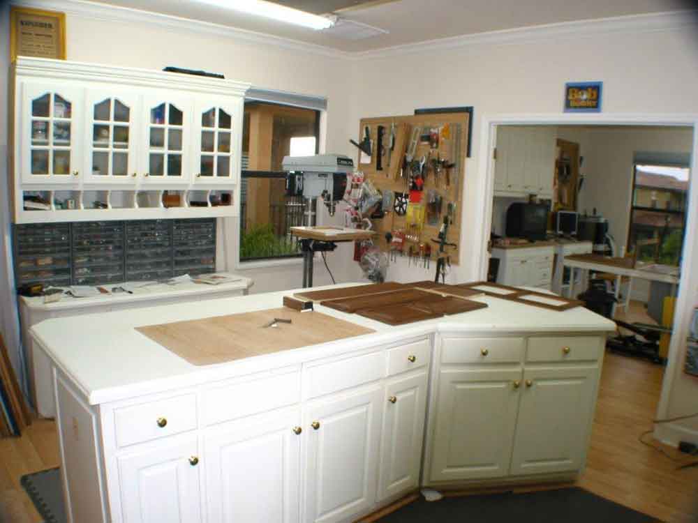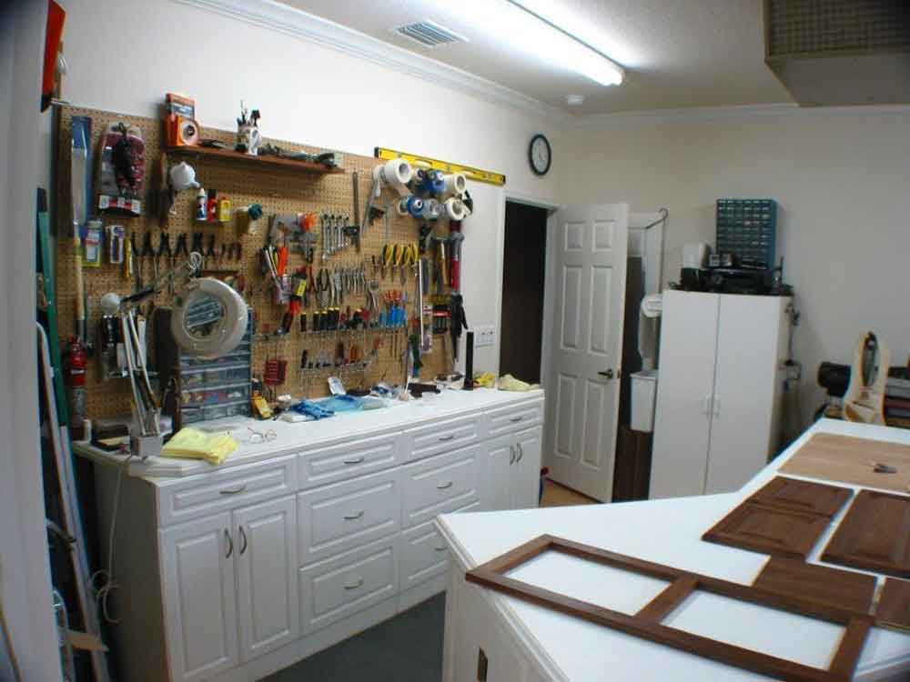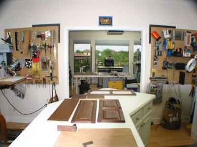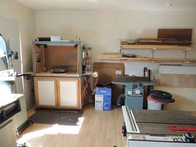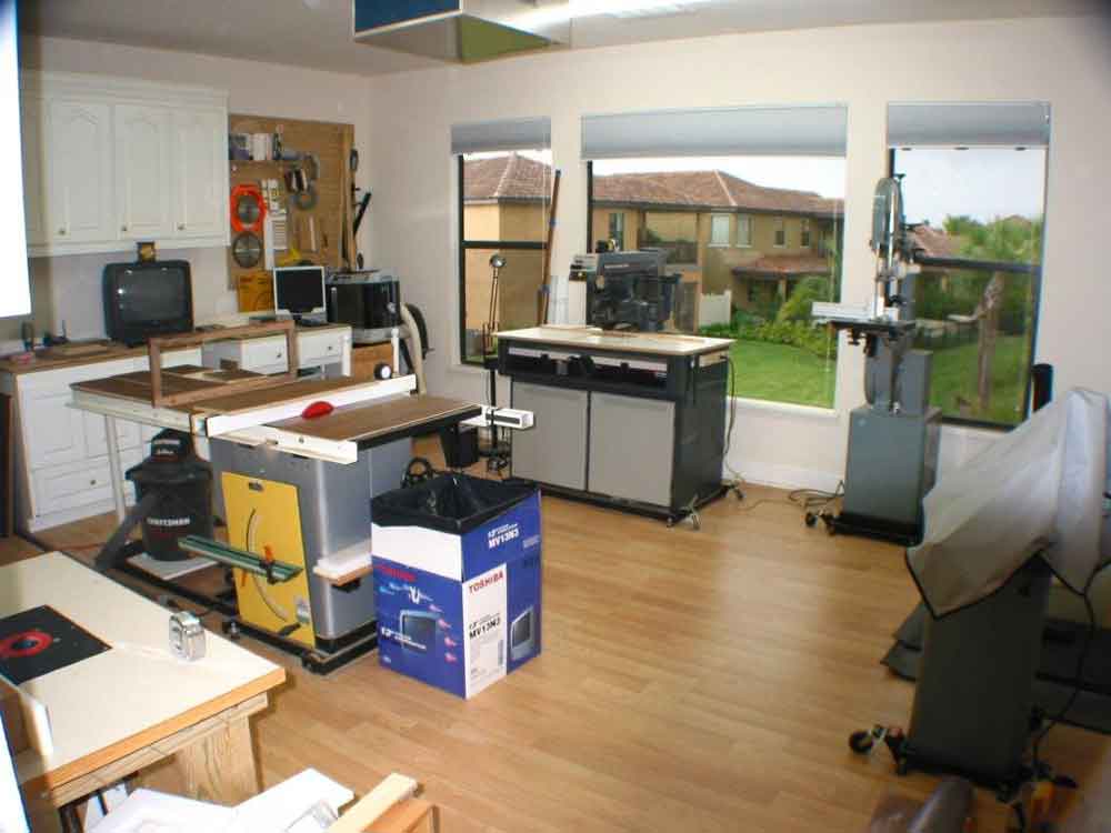 Here is my "Retirement Shop." Like everything else it has been downsized from a basement shop in Atlanta that measured 2500 sq. ft. to its new home of approximately 850 sq. ft. in Central Florida. The only machine that I am lacking is my old lathe because of its size, but I do have a vertical closet (not shown in the pictures) that stores my scroll saw, Tormek grinder, mortising machine, oscillating sander and bench grinder, all mounted on boards for easy movement to my workbench top. Also not readily visible in the photos are a Performax 16-32 belt sander, a Delta 12" planer, a 4' X 8' vacuum veneer system, a Legacy Ornamental Milling System, a refrigerator, a TV and two computers. There are two JDS ceiling mounted air purifiers and each floor machine has its own shop vacuum. The space itself is actually a converted bedroom and entertainment room that I connected with French doors. Fortunately, the floor under the Delta table saw was originally reinforced to support the weight of a pool table.