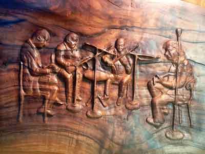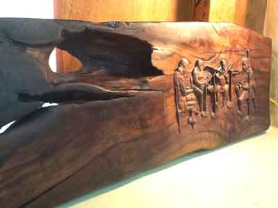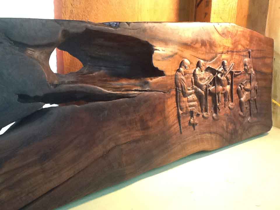 The piece below took close to a year to finish. This was my first relief. The piece was done for a doctor who plays music with some friends once a week. The wood came from his father's barn; the walnut is about 100 years old I was told.