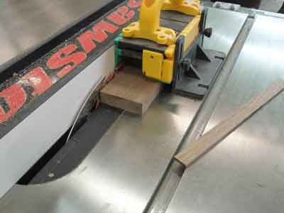There are a couple of ways that the GRR-ripper can be used to improve performance and safety that are hard to show in a stationary picture. The first is when ripping short boards. As I've mentioned a couple of times already, the GRR-ripper controls both the keeper and waste boards throughout a cut. With the GRR-ripper you can push the boards all the way past the blade and then slide both boards away from the blade and back towards yourself as shown in the following photograph. This keeps everything under control and safe!