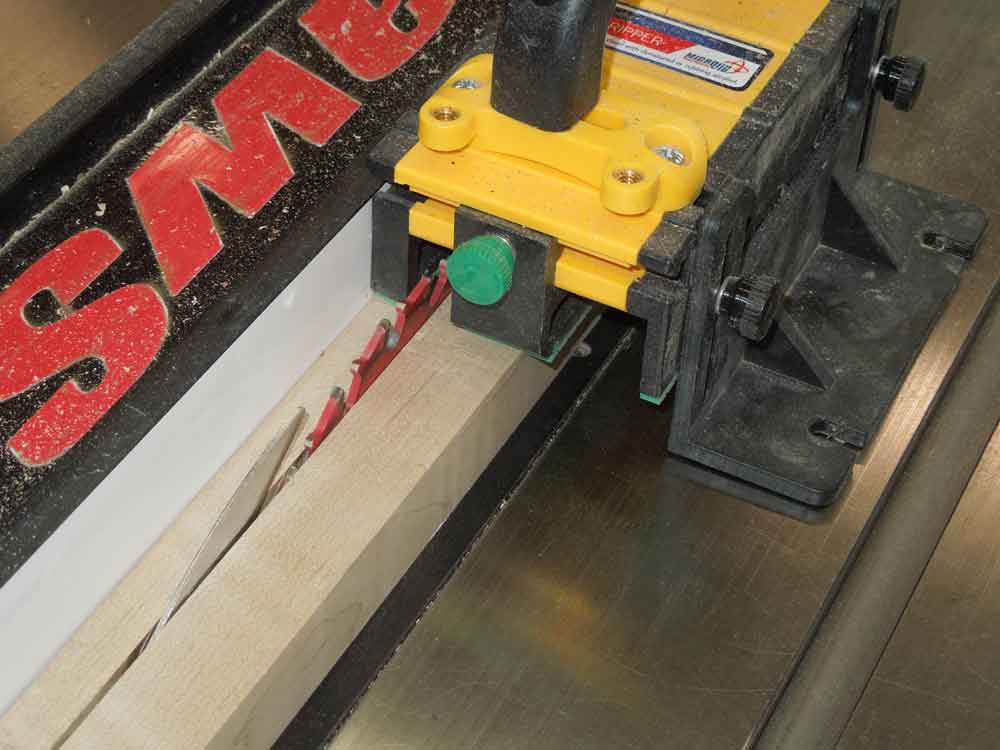 The key to the GRR-ripper system is that it supports and controls both the 'keeper' and 'waste' boards at the same time. You no longer have a waste board that stops next to the turning blade while a conventional push block continues to push the keeper board past the blade. In addition, the blade is running through a tunnel between two of the push block legs.