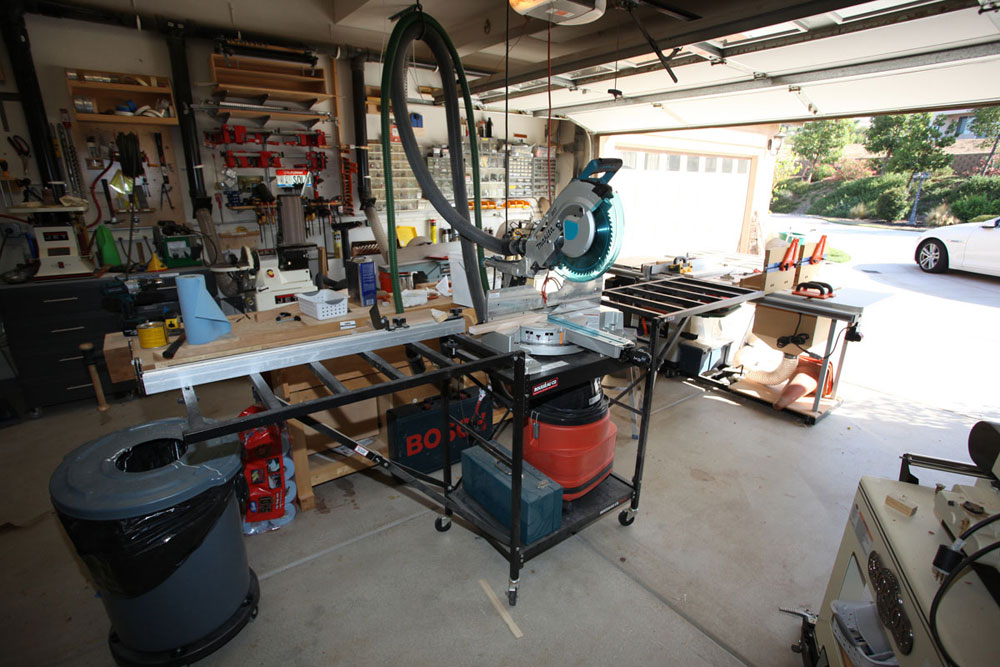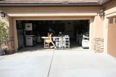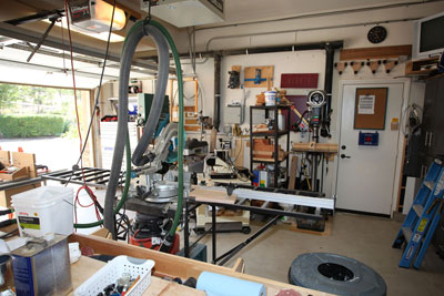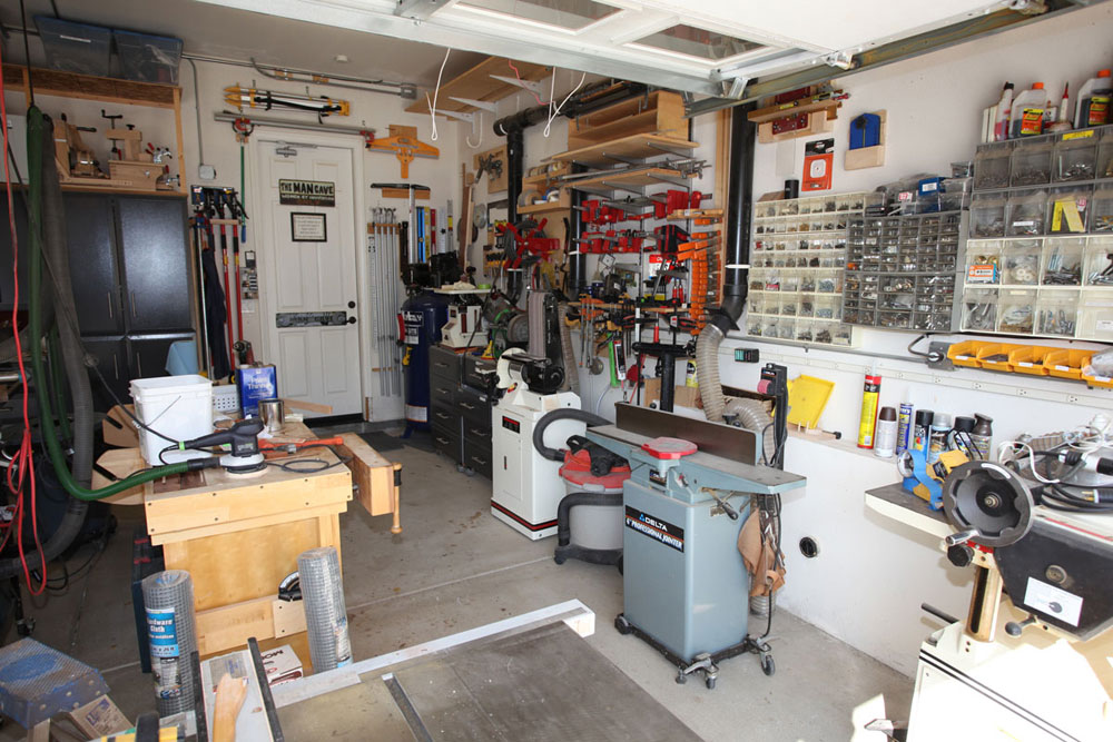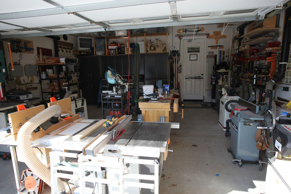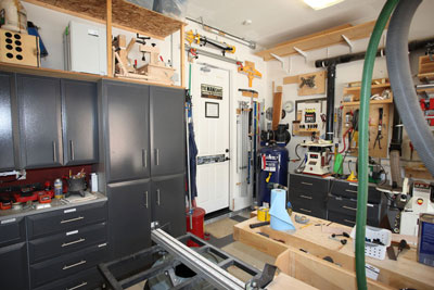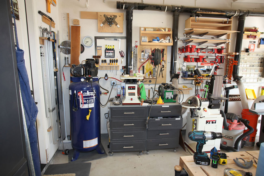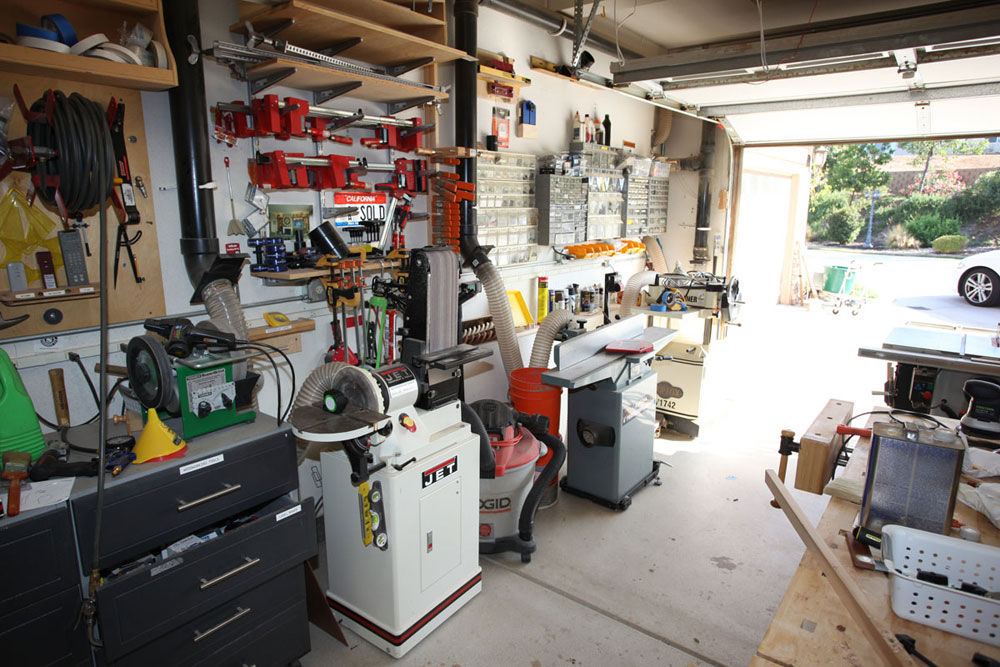 I had saw cut the concrete floor to place my electrical and dust collection below ground so as not to impede the pathways. All my tools with the exception of the work bench are on wheels. On the larger builds I can extend the shop to the driveway in front of the garage. I have the dust collector in the other garage with the piping coming from the adjacent wall. This makes it a lot quieter when running the vacuum.