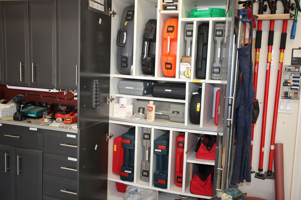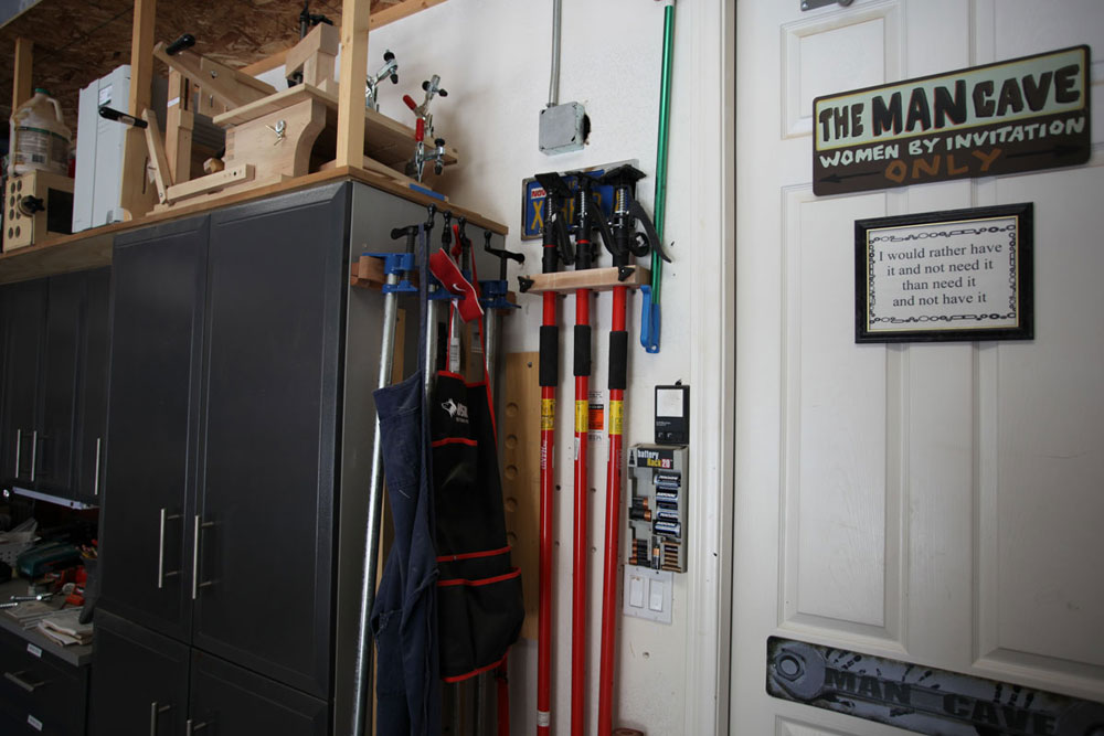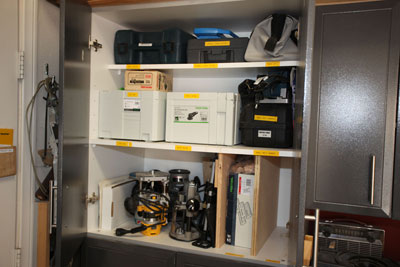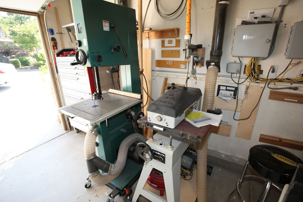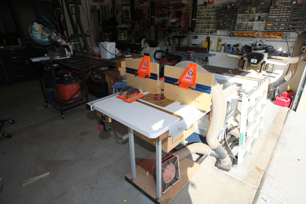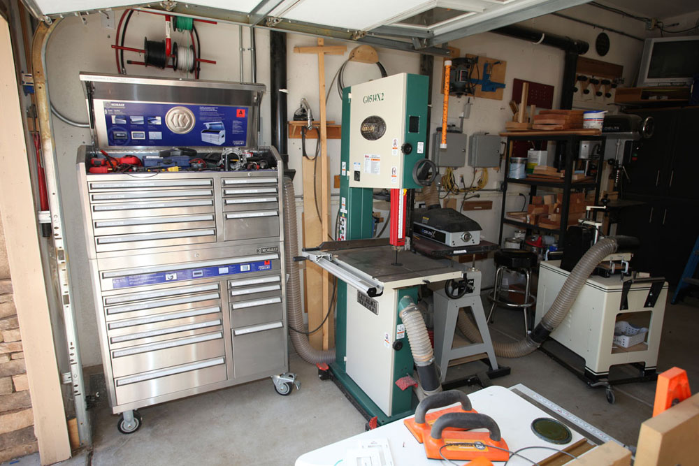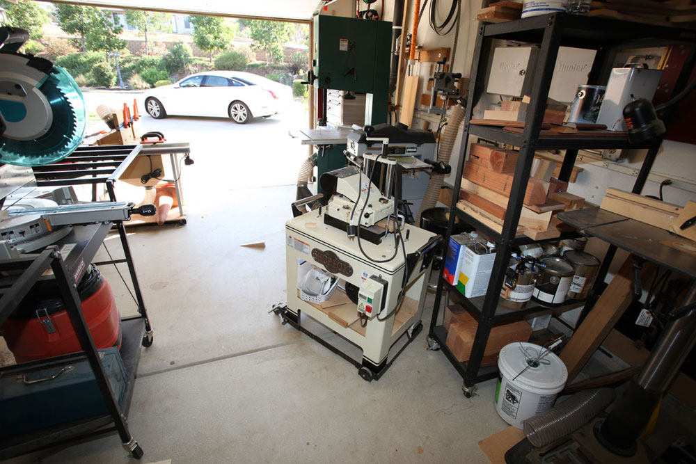 I had saw cut the concrete floor to place my electrical and dust collection below ground so as not to impede the pathways. All my tools with the exception of the work bench are on wheels. On the larger builds I can extend the shop to the driveway in front of the garage. I have the dust collector in the other garage with the piping coming from the adjacent wall. This makes it a lot quieter when running the vacuum.