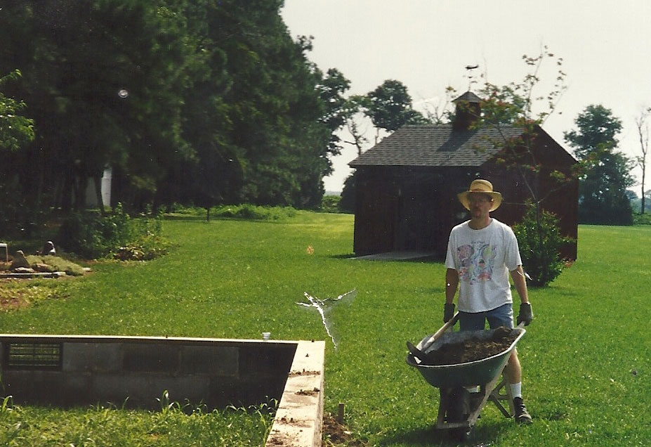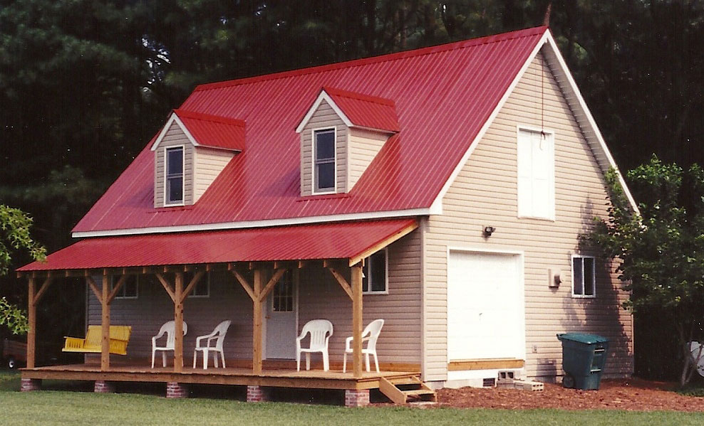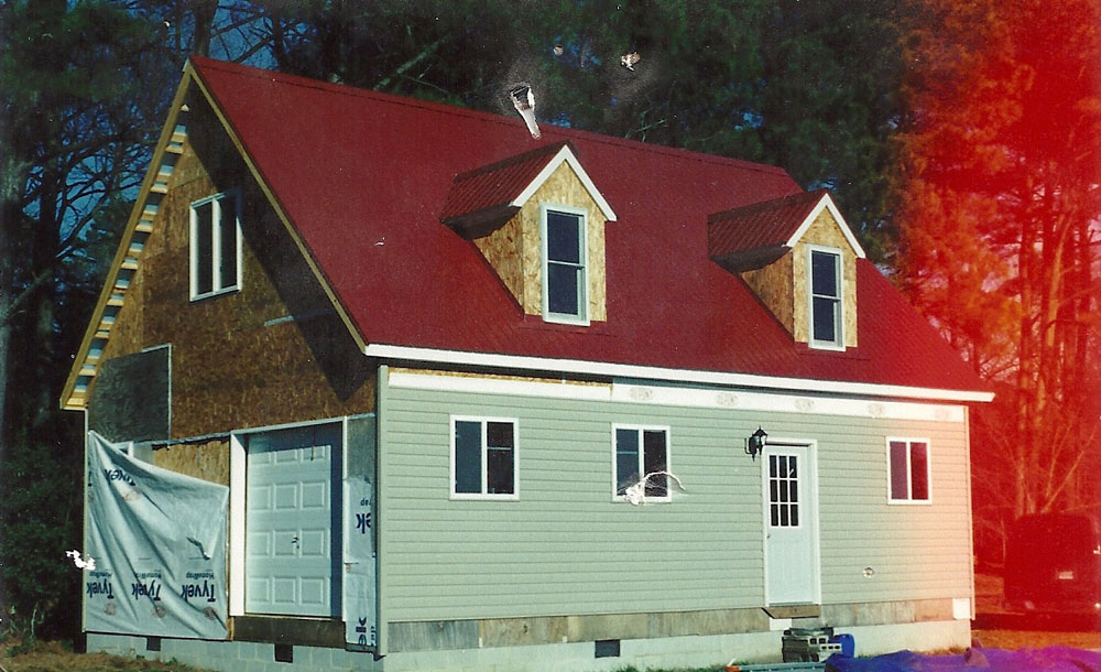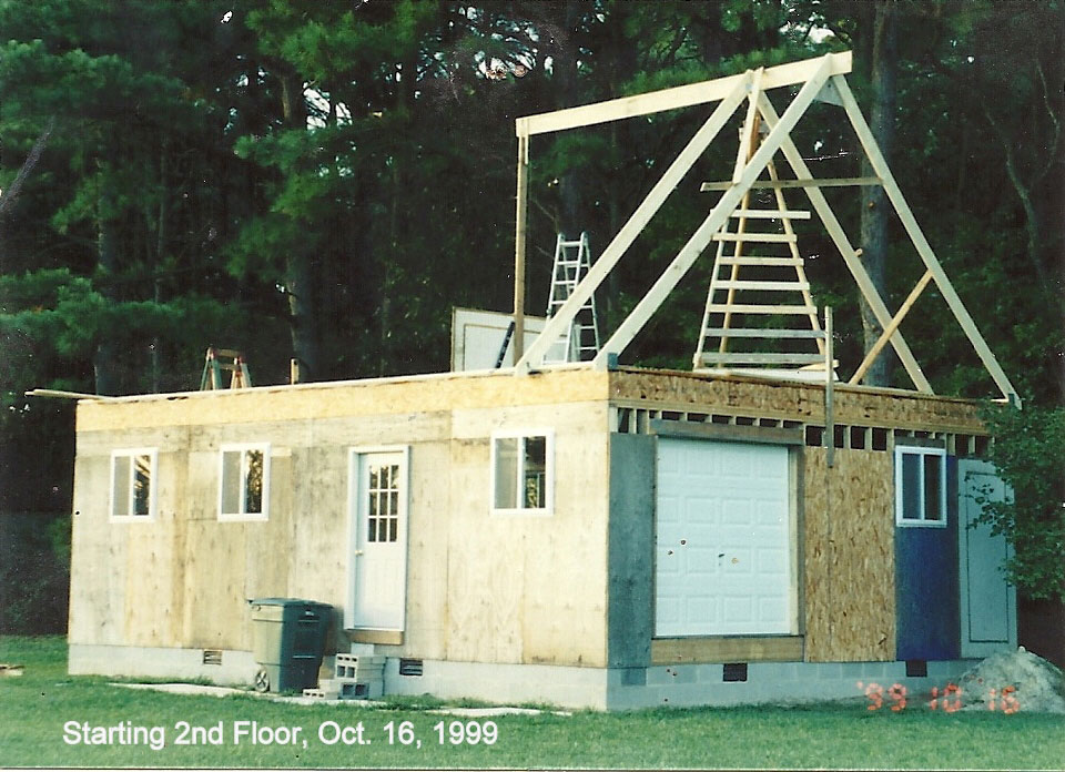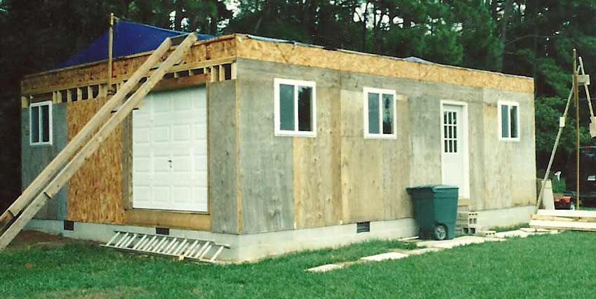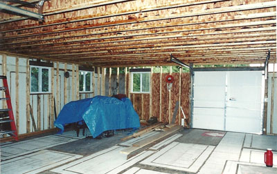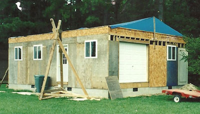 I started by purchasing plans from a lumber yard ($6) for a 24' X 32' 2 car garage (now the size and location of my shop). I made modifications to the plans (moved the garage doors to 1 on each side of the building, and removed some center posts that would get in the road, added dormers and a porch for looks, etc..) and I started digging the footer in April of 1996.
