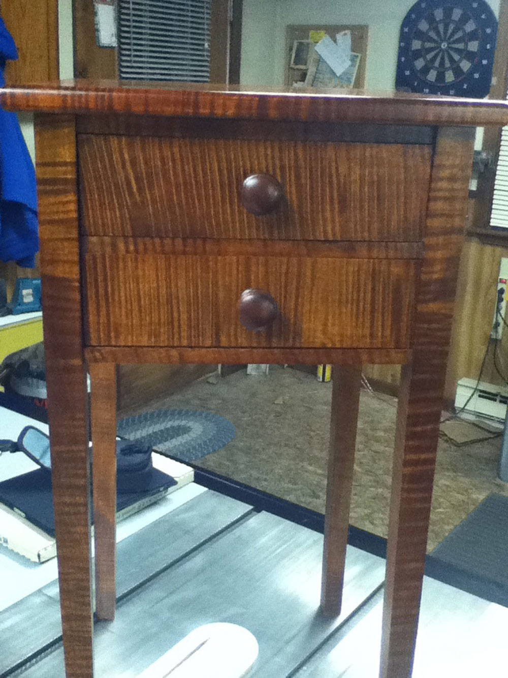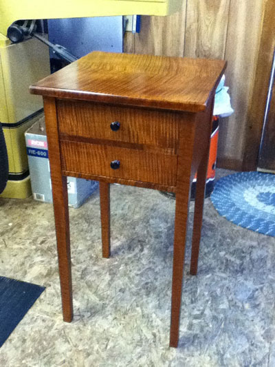 The small nightstands are made of both veneer tiger maple and regular boards of tiger maple. This is my favorite thing to make, I give them away as wedding presents to family members. I think they're great wedding presents because they will last long after I am gone. And I threaten them to never paint the table.